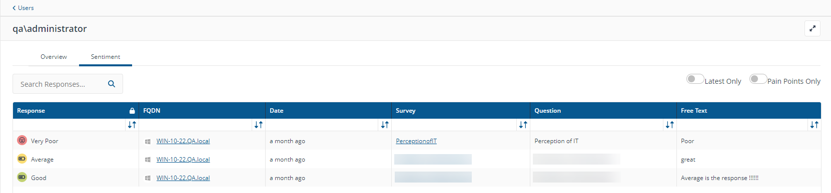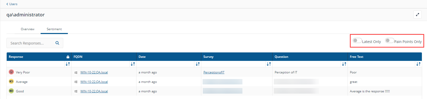 Turn on the Latest Only toggle to view only the latest responses to the survey. You can also select to display only the responses that are rated poor or very poor by turning on the Pain Points Only toggle.