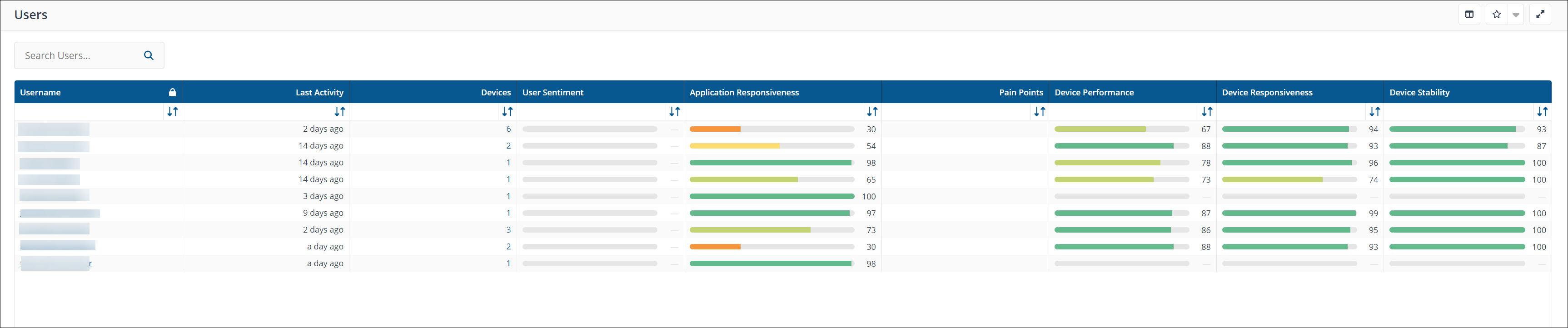 The Users page displays user experience information, including measurements of how well the devices are providing the users with a good experience, combined with their user survey responses.