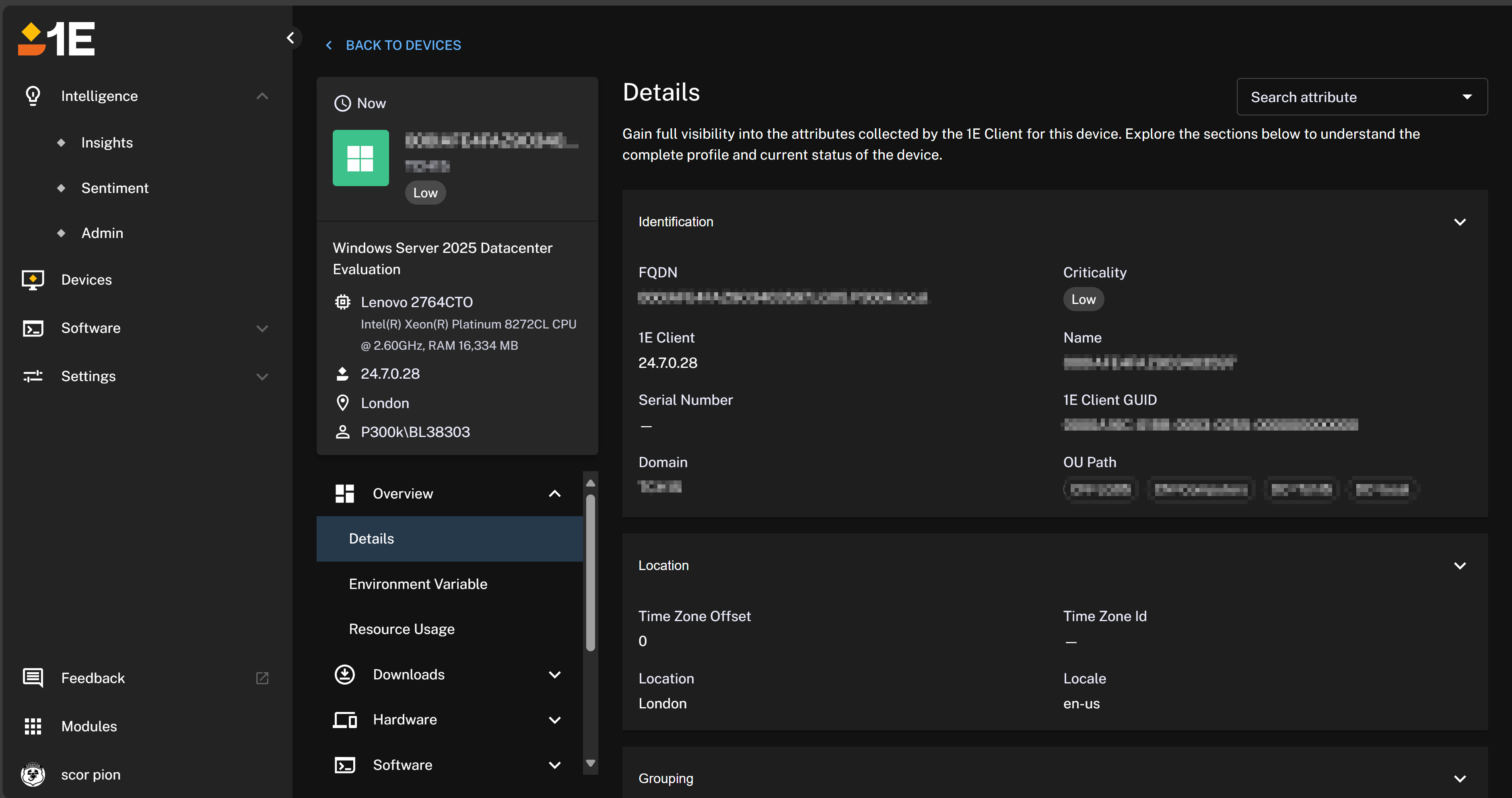 A new and improved version of the device pillar is now available. To access this, navigate to Inventory Insights or 1E Intelligence from the module selector, and then navigate to a device pillar either via Intelligent Insights or Devices. Refer to Inventory Insights and Intelligent Insights.