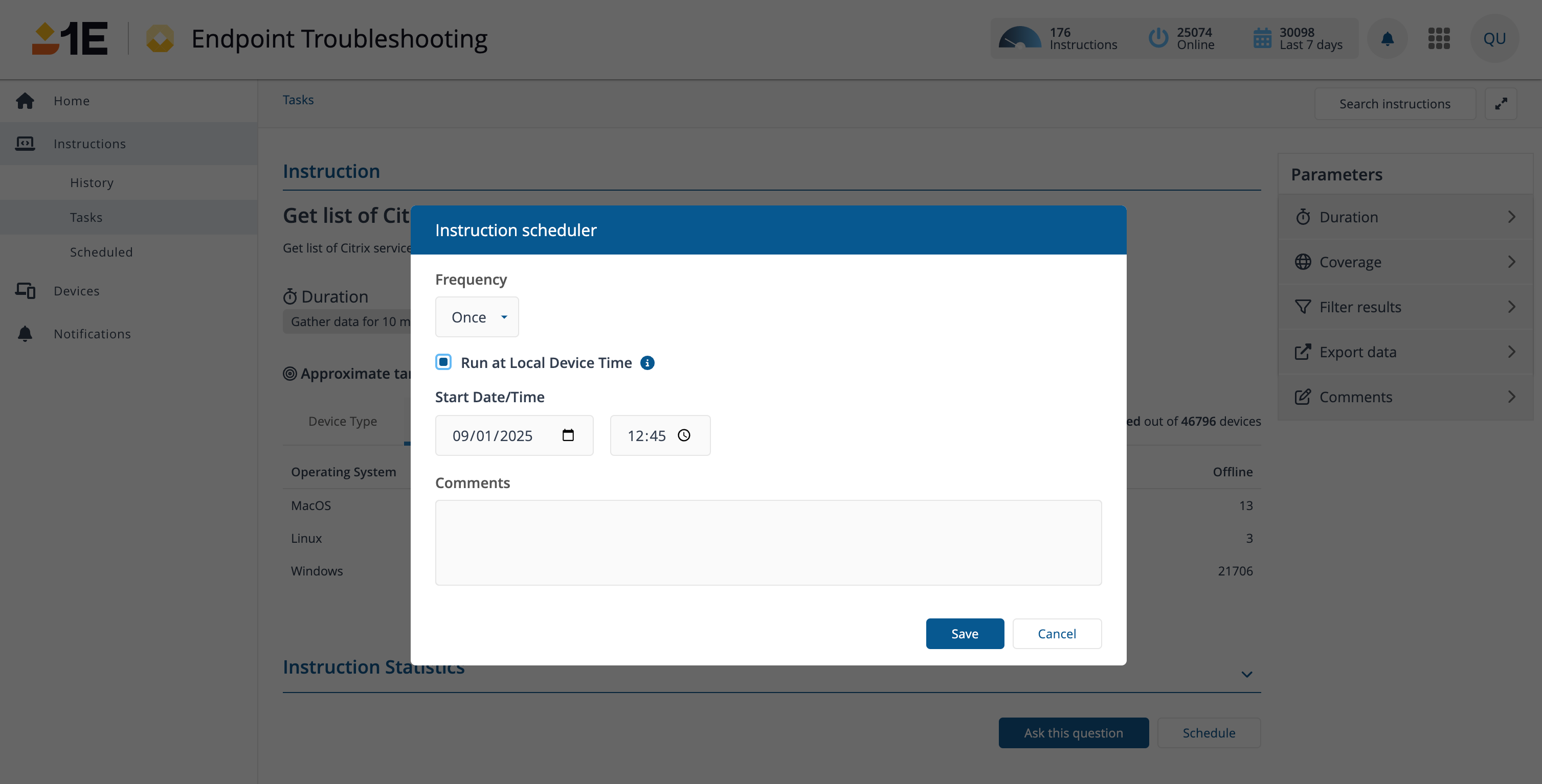When using Run at Local Device Time, the scheduled instruction will have a longer execution time on the platform to accommodate all time zones. The 25.1 1E Client has a new execution window that will include the instruction start time and end time to ensure that the instruction will run during the correct time window. Devices that are offline at the start of the execution window will run the instruction when they come online, assuming that the execution window end time has not been reached.