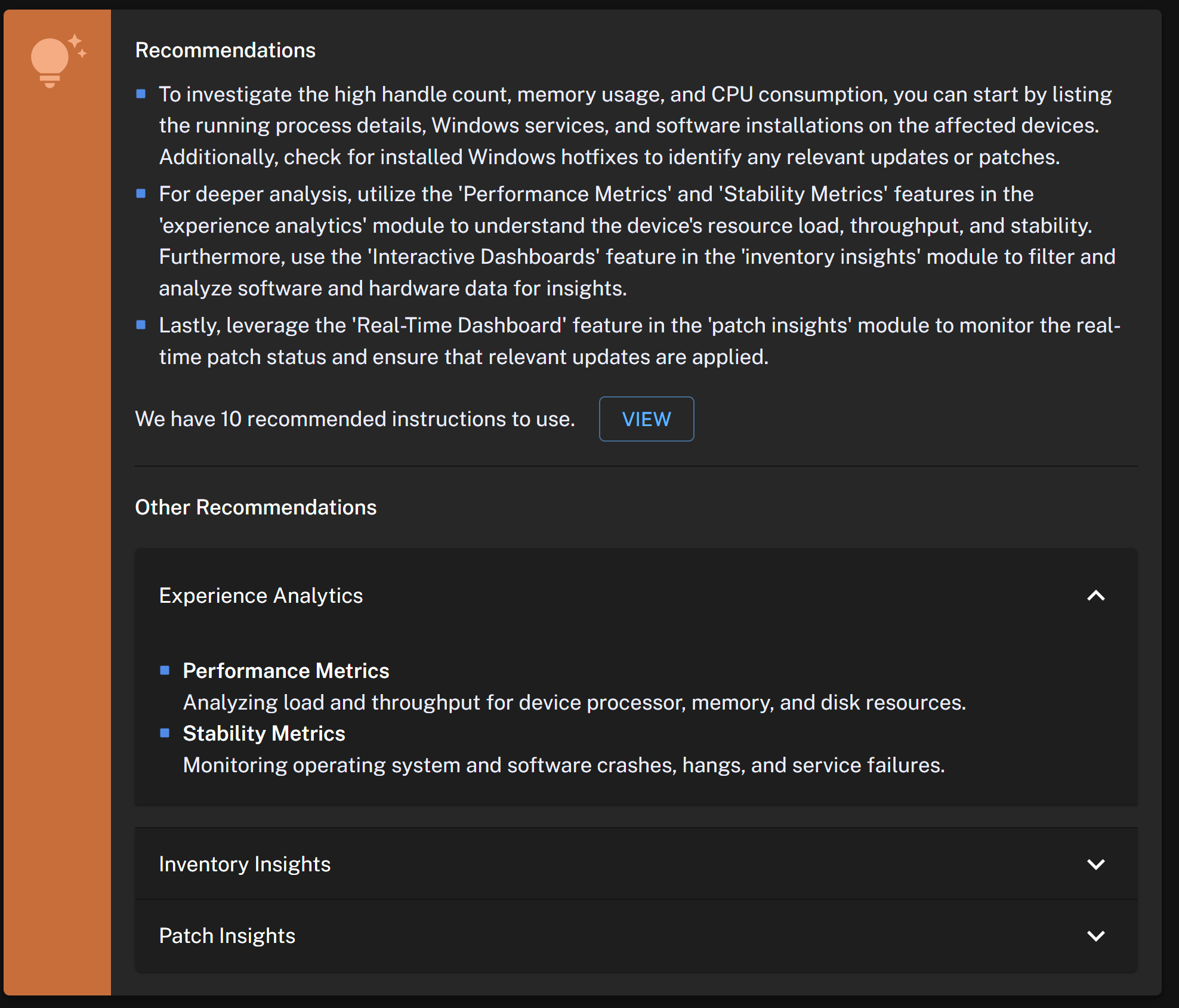 1E Platform-specific recommendations: In addition to recommending Endpoint Troubleshooting instructions, Insights can now recommend how specific capabilities of the 1E Platform might be leveraged as part of investigating or remediating a problem. In addition, recommendations now exist in their own distinct card on the insight page.