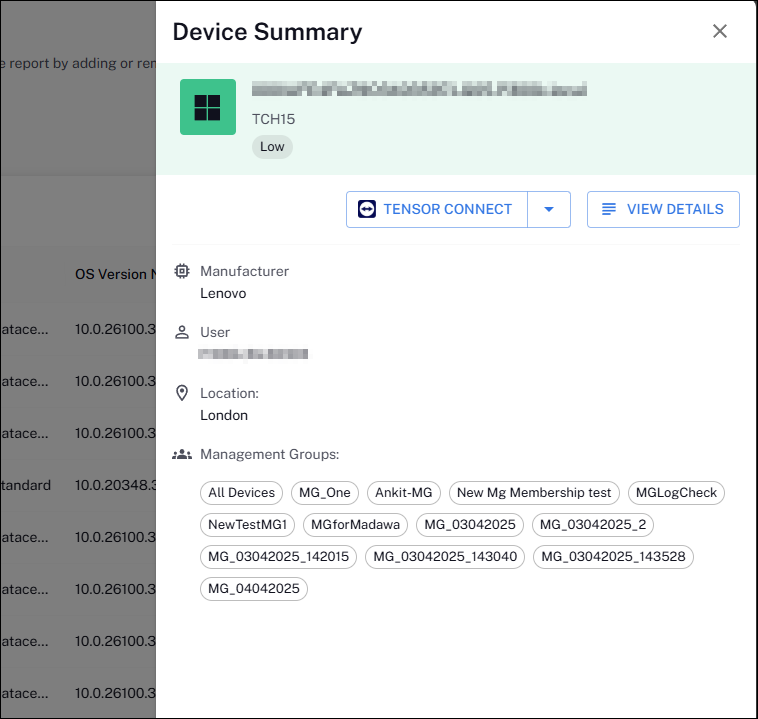New device drawer: We've introduced a new device drawer that displays fundamental device information without needing to open the full device pillar. Users can navigate to the device pillar, or take actions like run instructions or connect using our TeamViewer Tensor integration. Refer to Device Summary card.