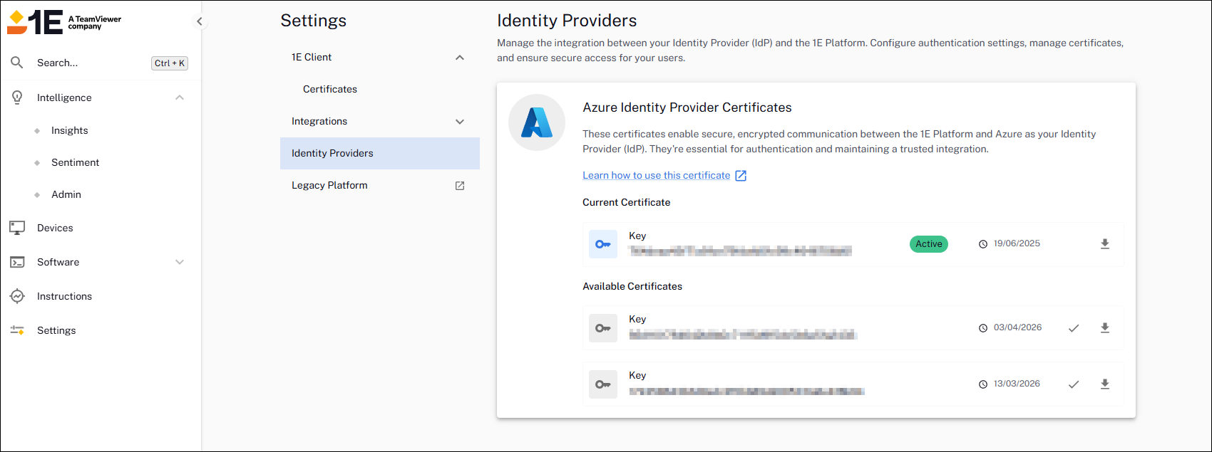 With this feature, 1E Platform administrators can now manage their IdP certificates directly within the 1E Platform interface. This enhancement improves the user experience when rotating IdP certificates, ensuring uninterrupted access to the 1E Platform.
