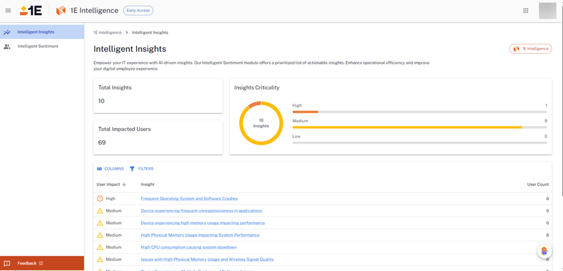 We are thrilled to announce that 1E Intelligence is entering early access. This provides access to two initial capabilities: Intelligent Insights and Intelligent Sentiment. Read on to find out more about these exciting new additions to the 1E Platform, how they can benefit your business, and how you can get access.