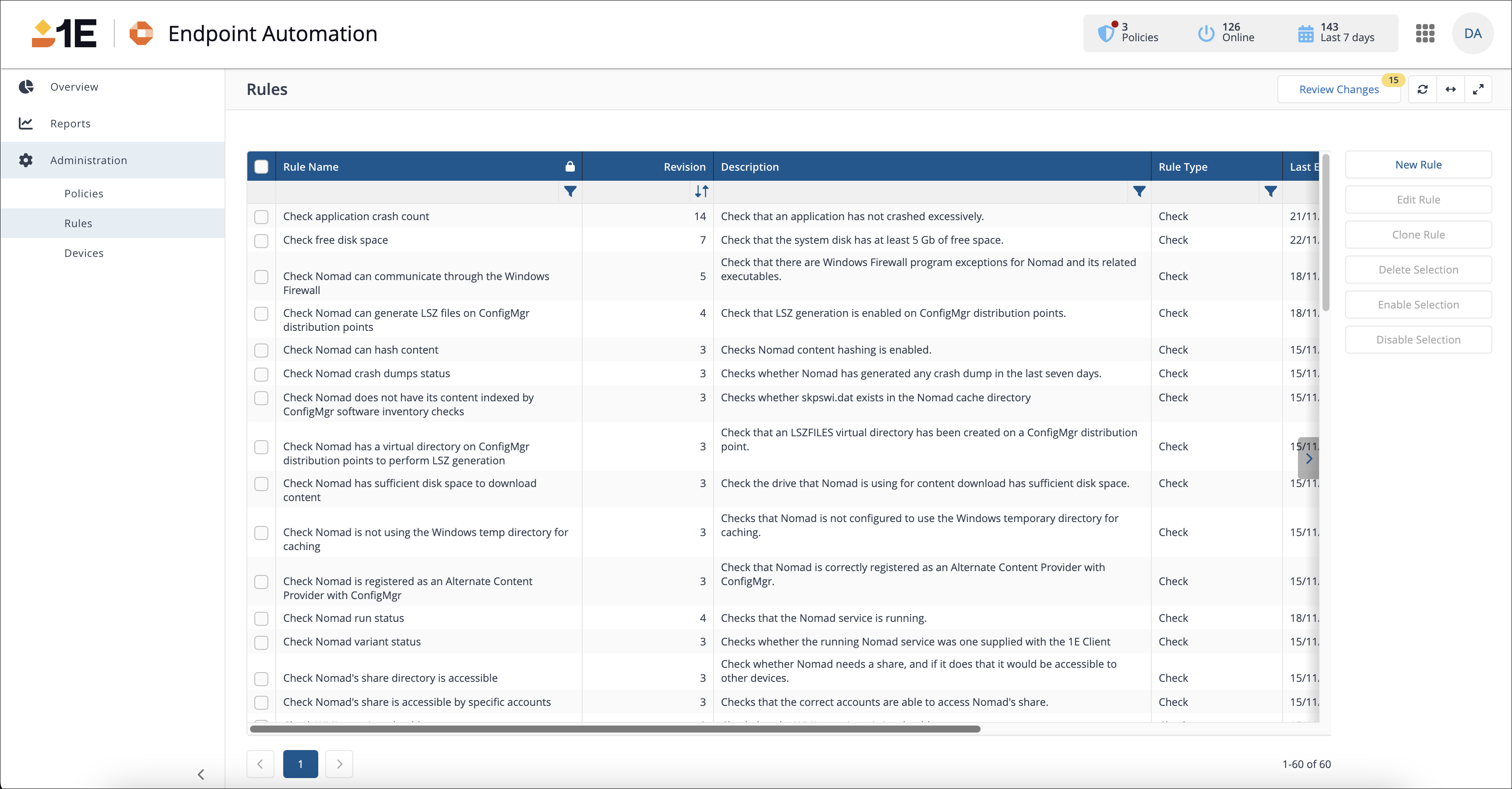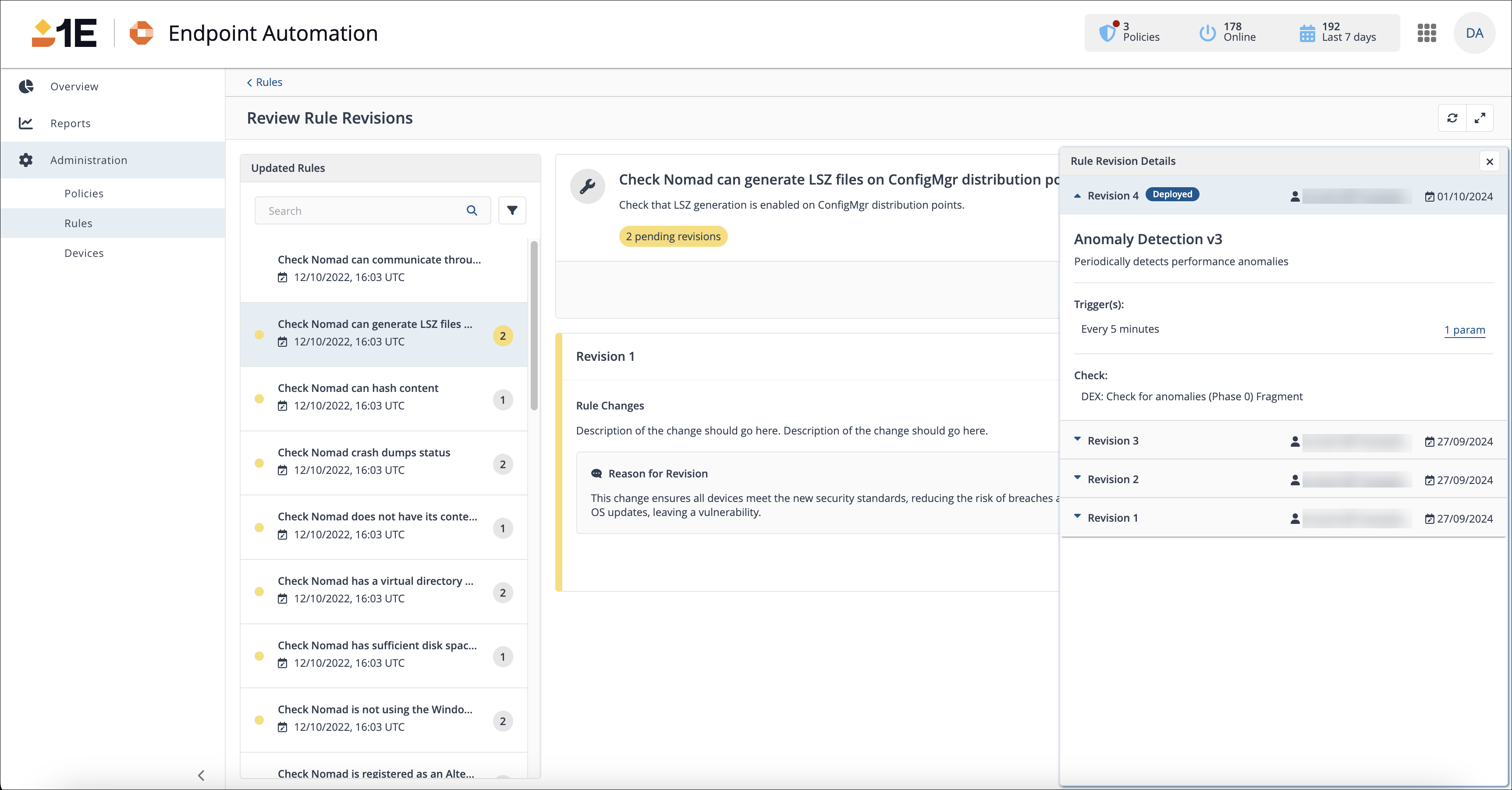 This next iteration of operational safeguards within the 1E Platform introduces Rule Approval. Rule Approval focuses on visibility and the impact of rule revisions within 1E Endpoint Automation. By having a clear understanding of the impact of change, admins are able to make a well-informed decision on whether they would like to either approve or reject the request. Refer to Rule revision and approval.