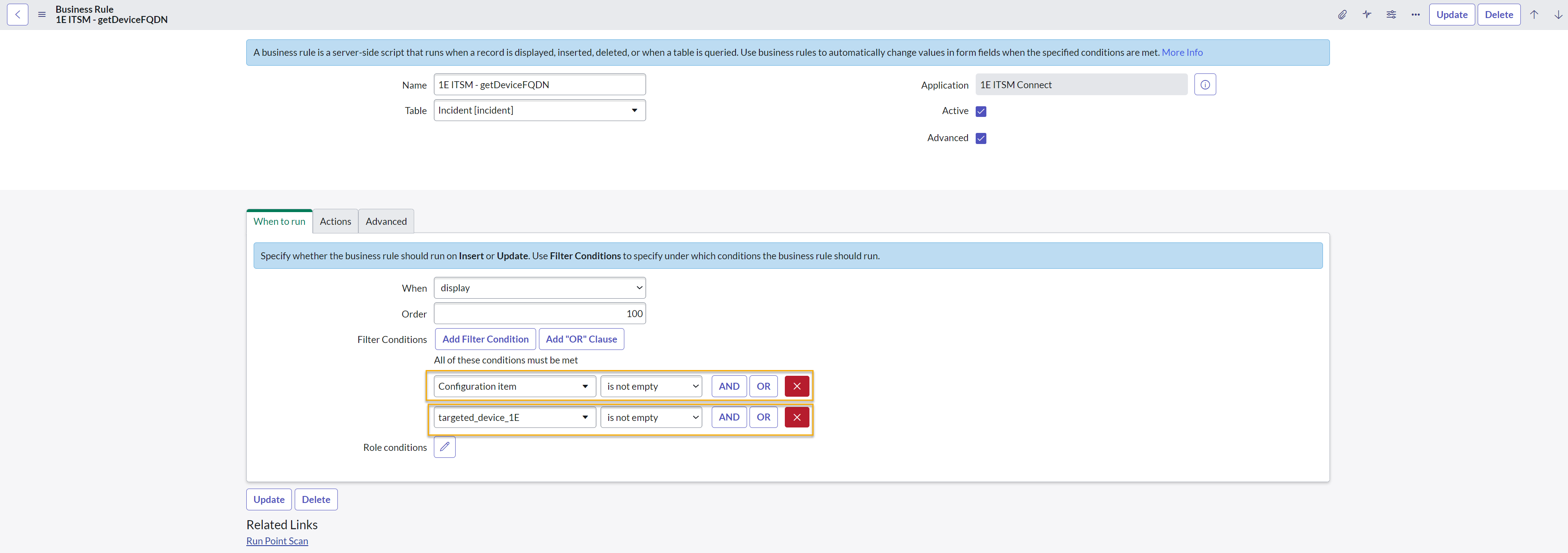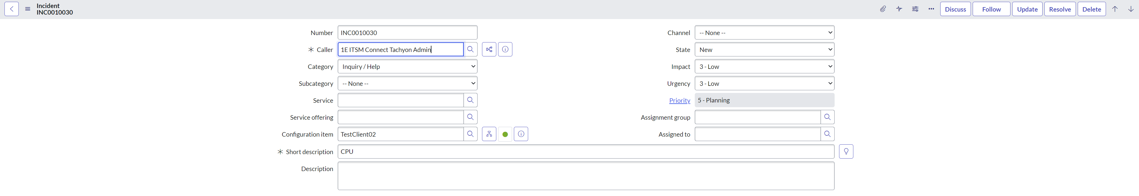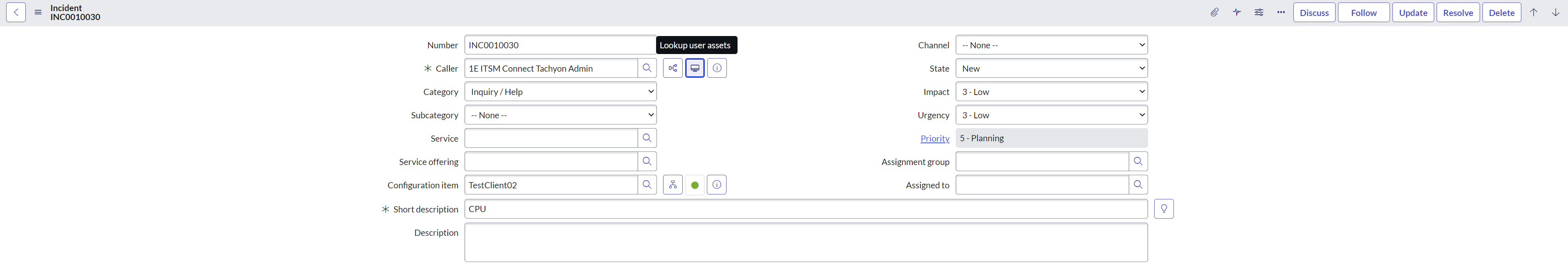 Any type of incident can be raised for any kind of CI in ServiceNow. To have control on what type of CIs the 1E ITSM Connect functionality (i.e. Device Info icon, 1E ITSM Connect and 1E CMDB Connect) should work, the app should configure the system property x_1e_connect.device_info_ci_criteria. The default value of this property is sys_class_name=cmdb_ci_pc_hardware^ORsys_class_name=cmdb_ci_computer, which states that the selected device class should be either ci_pc_hardware or cmdb_ci_computer. This property contains an encoded query to define the criteria for valid CIs. Therefore, any incident where CI fulfills this criterion will show the 1E ITSM Connect functionality.