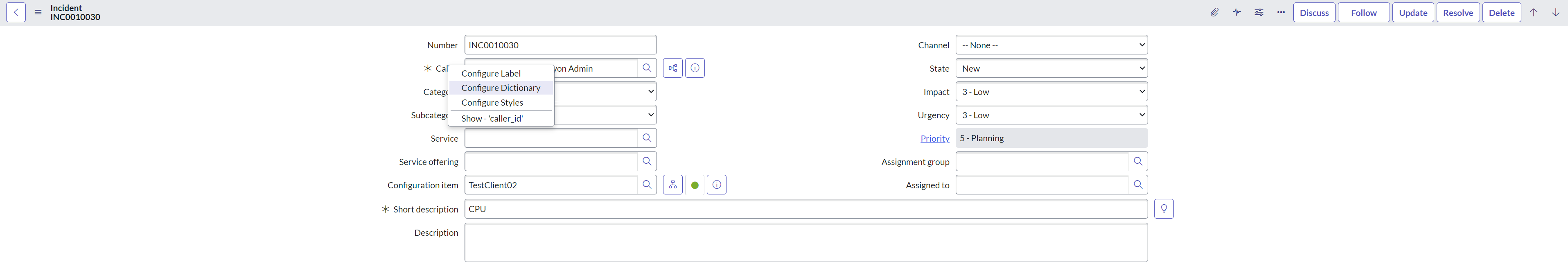 Right-click the field label and select Configure Dictionary from the drop-down list that appears.