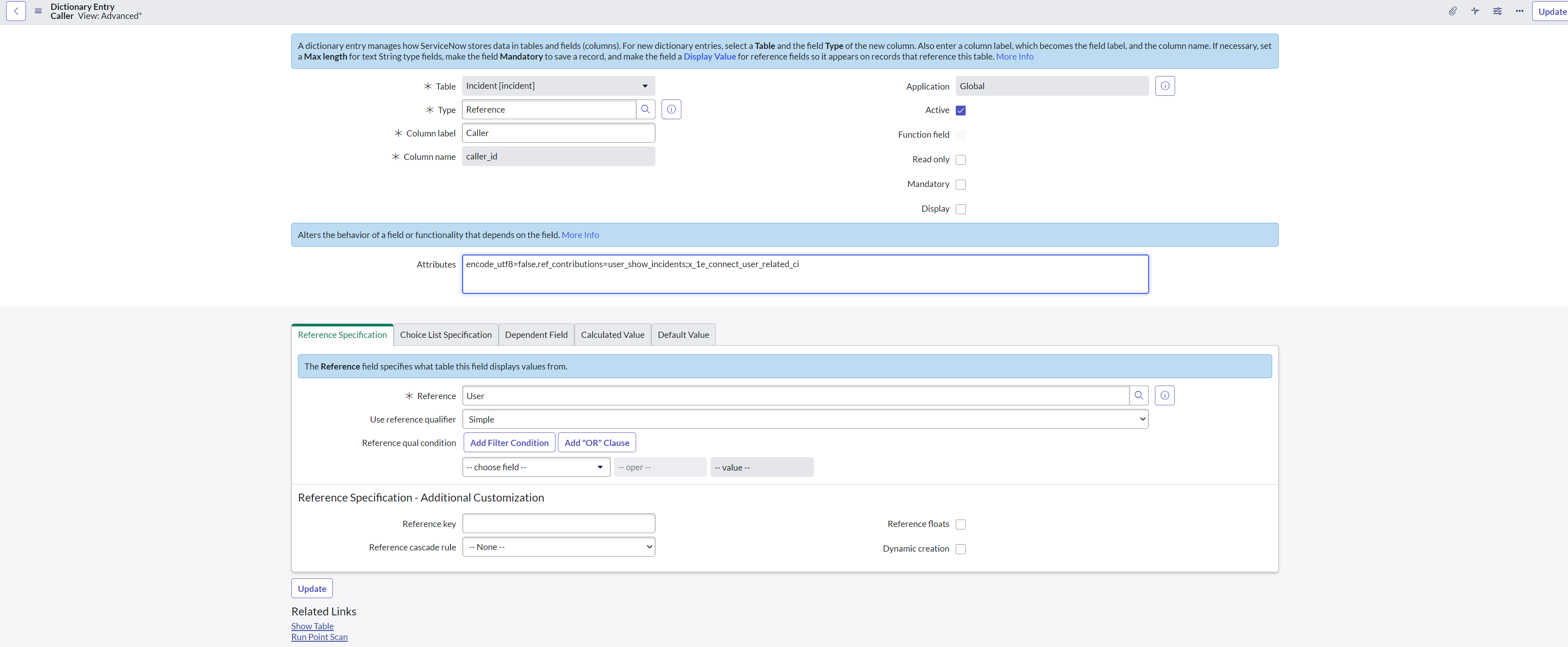 It opens the Dictionary Entry - Caller page. Now select the column with label Attributes on the page and append the value with x_1e_connect_user_related_ci. Click Update to save the changes.