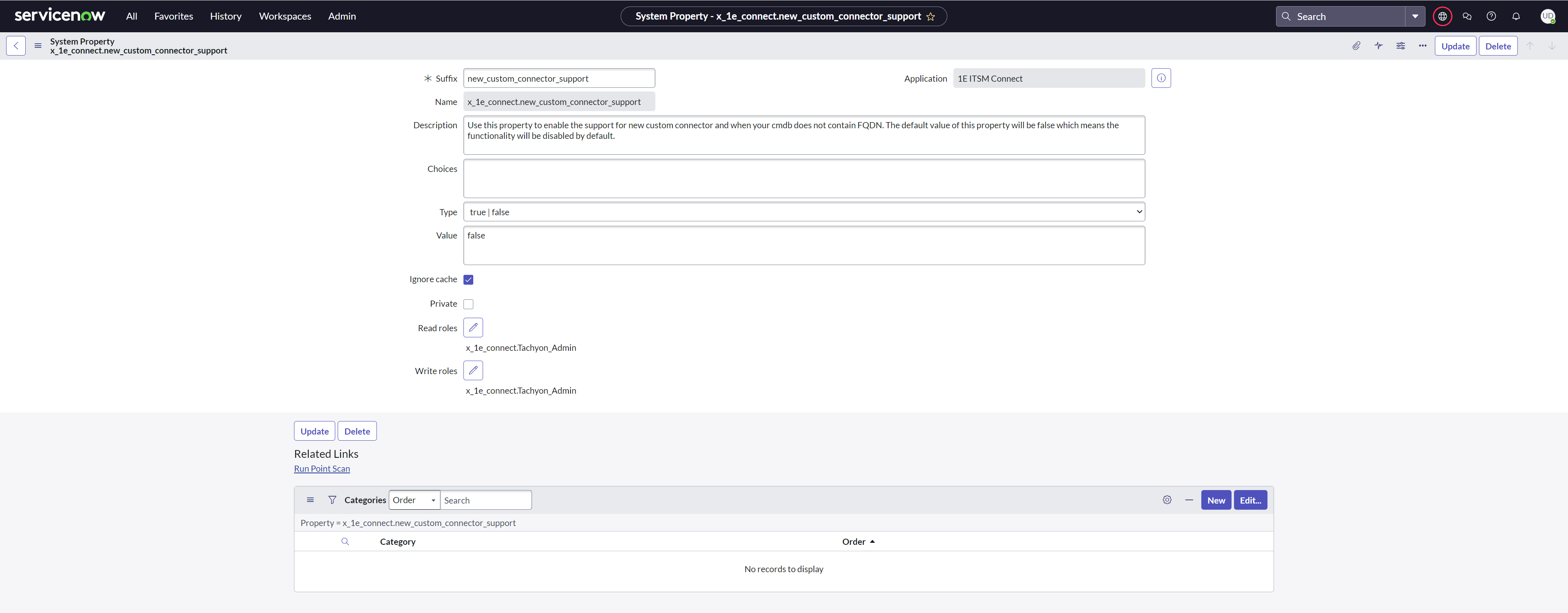 This is an optional system property. It can enable or disable 1E ITSM Connect application features based on the category and subcategory of the incident. To enable this feature, configure the system property x_1e_connect.enable_itsm_category_subcategory. By default, this property is set to false.