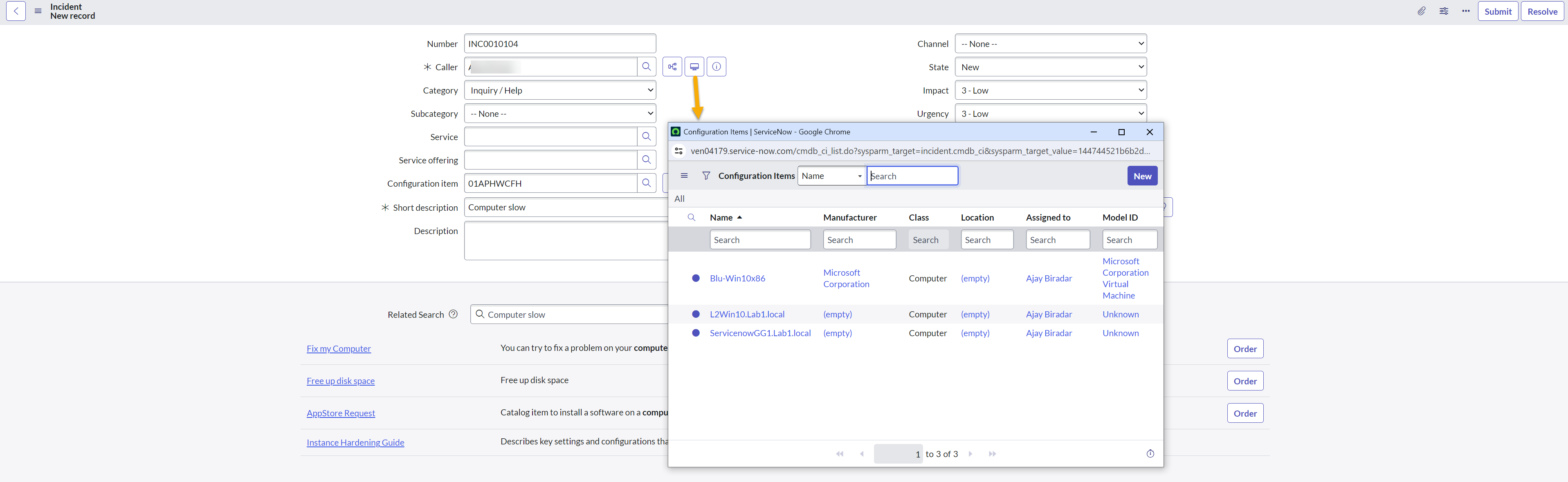 Select the Caller field from the incident form to add the CI selector icon, as shown in the picture below.