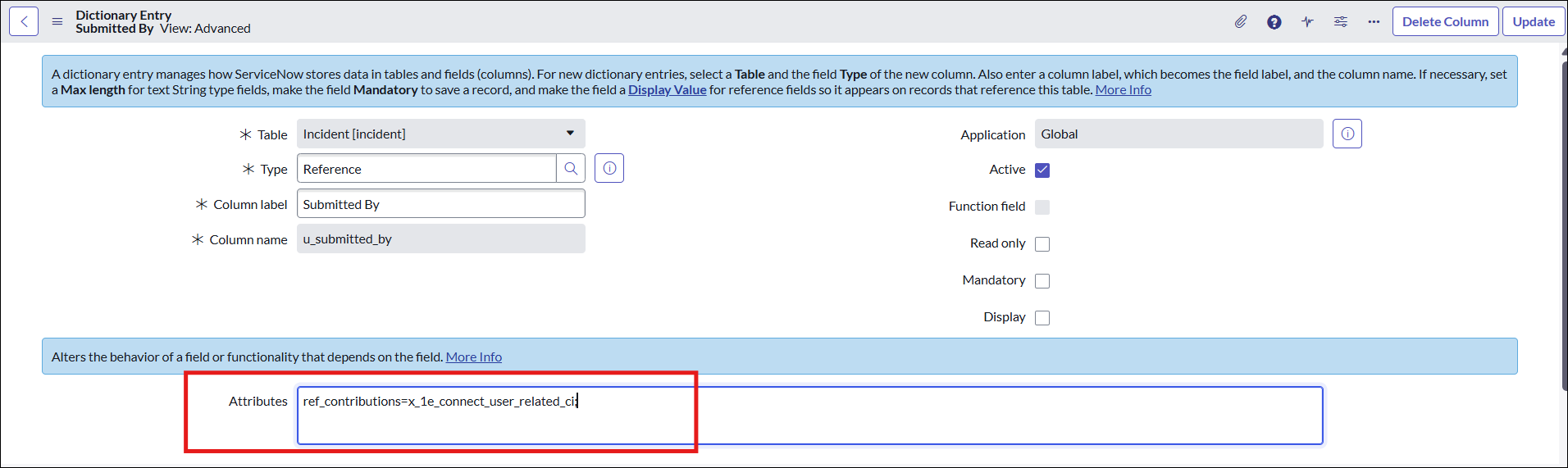 It opens the Dictionary Entry page. In the Attributes field, append the value with ref_contributions=x_1e_connect_user_related_ci. Click Update to save the changes.