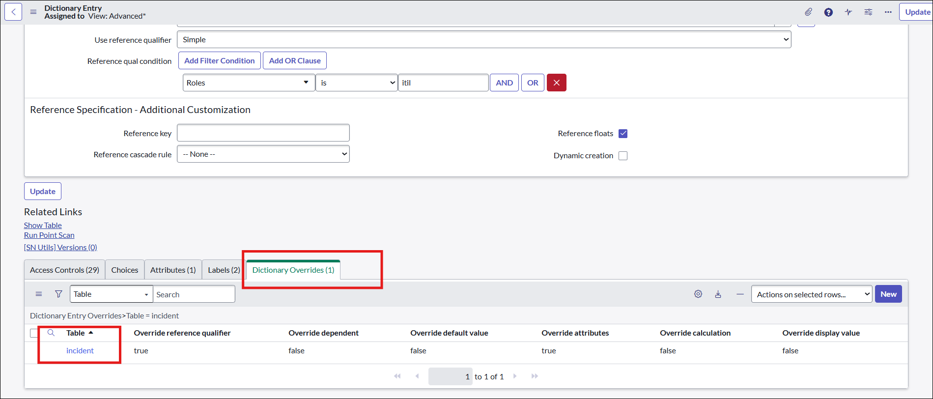 It opens the Dictionary Entry page. Since the Assigned to field is inherited from the Task table, we need to add the attribute to the Dictionary Override of the Incident table as shown below.