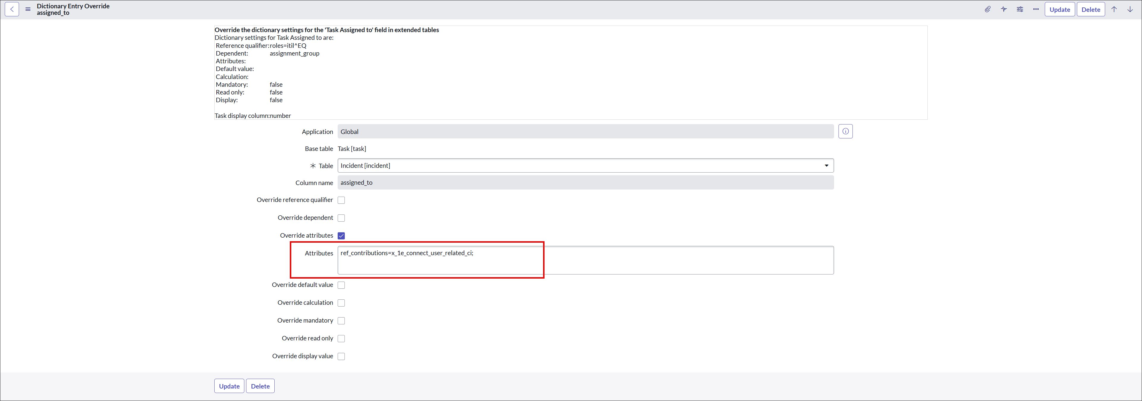 Open the Dictionary Override record of the Incident table and append the Attribute field value with ref_contributions=x_1e_connect_user_related_ci. Click Update to save the changes.