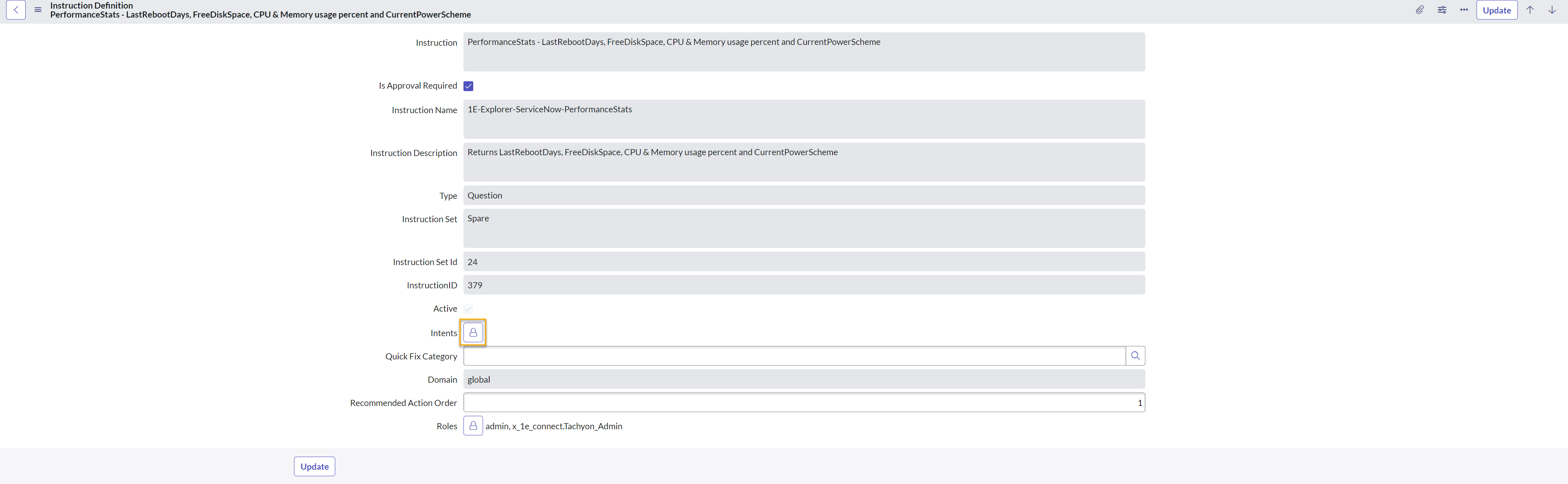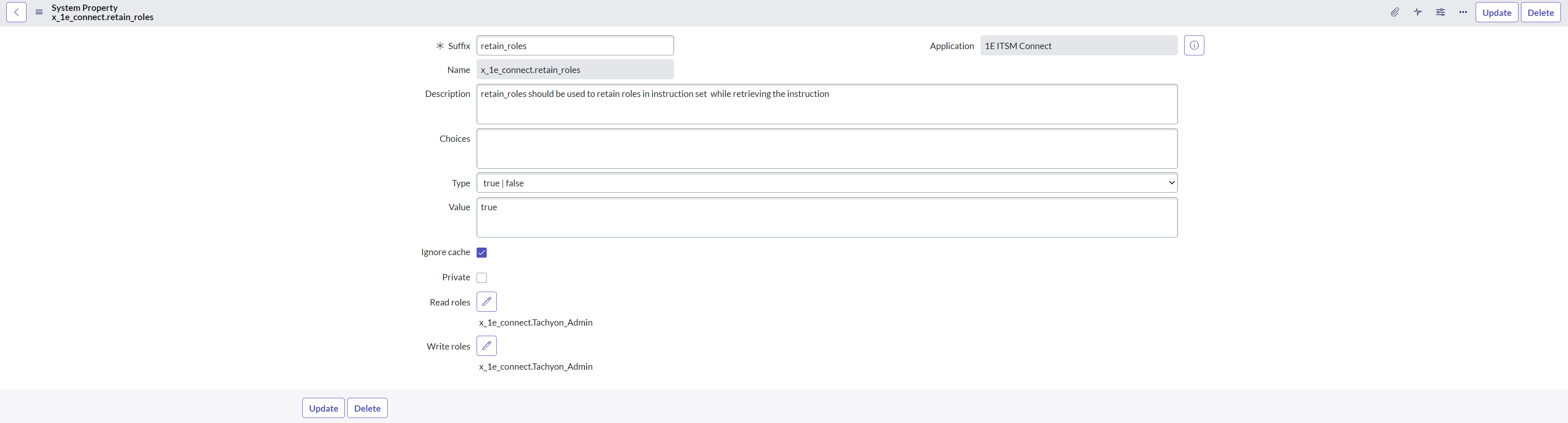 The 1E ITSM Connect application's default behavior is that whenever the instructions are retrieved, the respective instruction sets are generated and each instruction set is assigned admin and tachyon admin as default roles.