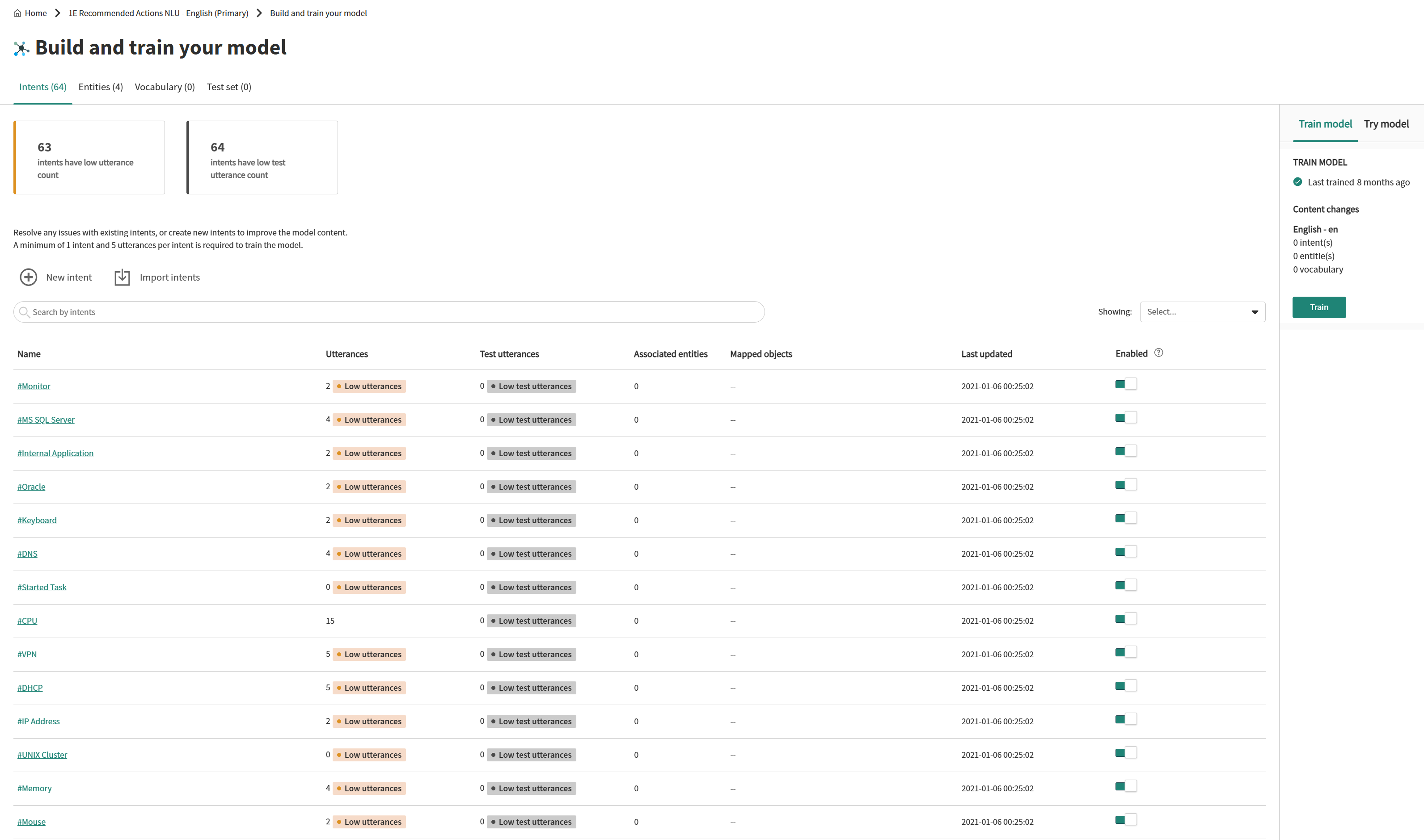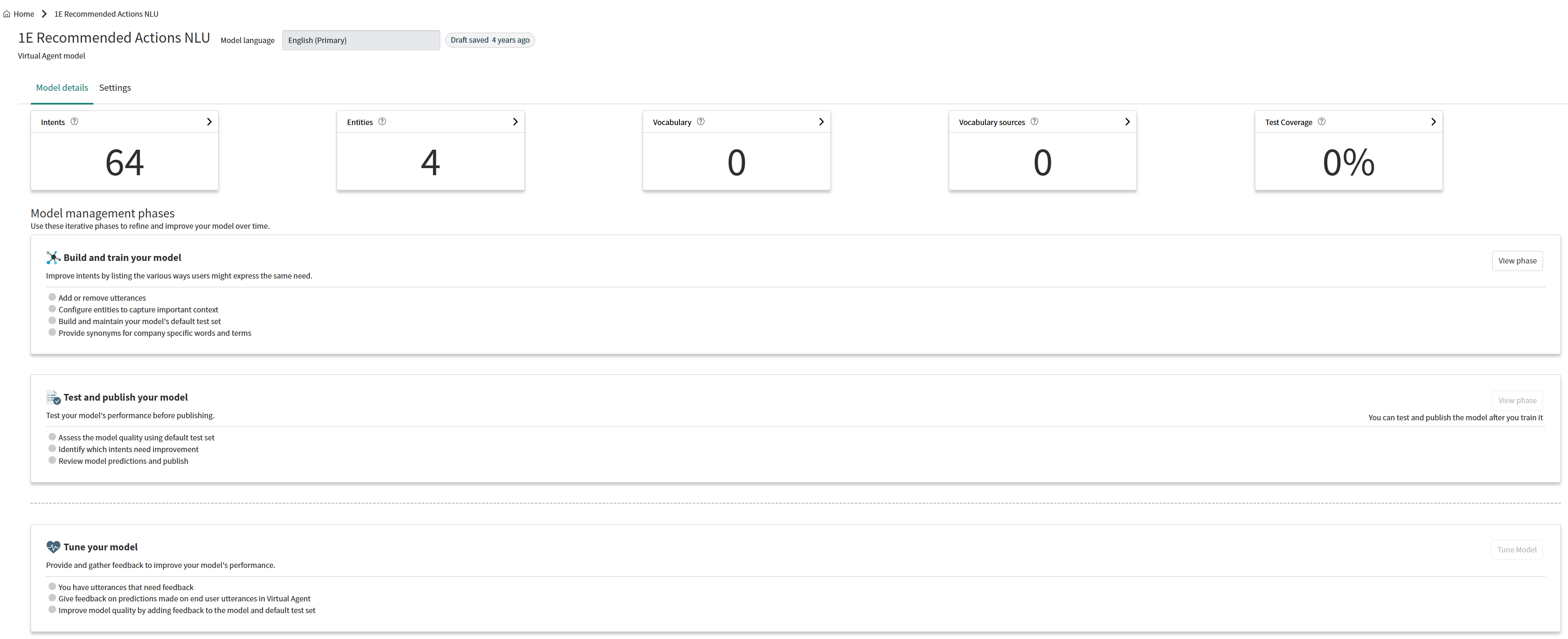 Click the model, 1E Recommended Actions NLU (English), to open the record. This opens the model details page, as shown in the picture below.
