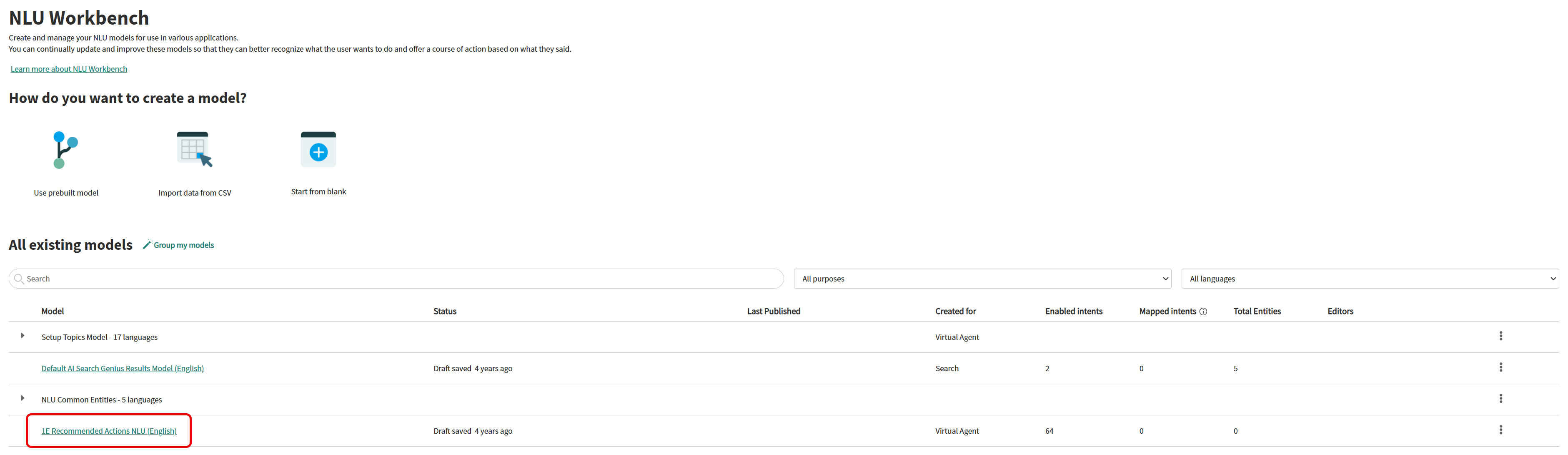 Navigate to NLU Workbench > Models in the application navigator. The page NLU Workbench opens up with the list of All existing models on the right side of the window panel. Look for the 1E Recommended Actions NLU (English) model in the list as shown in the picture below.