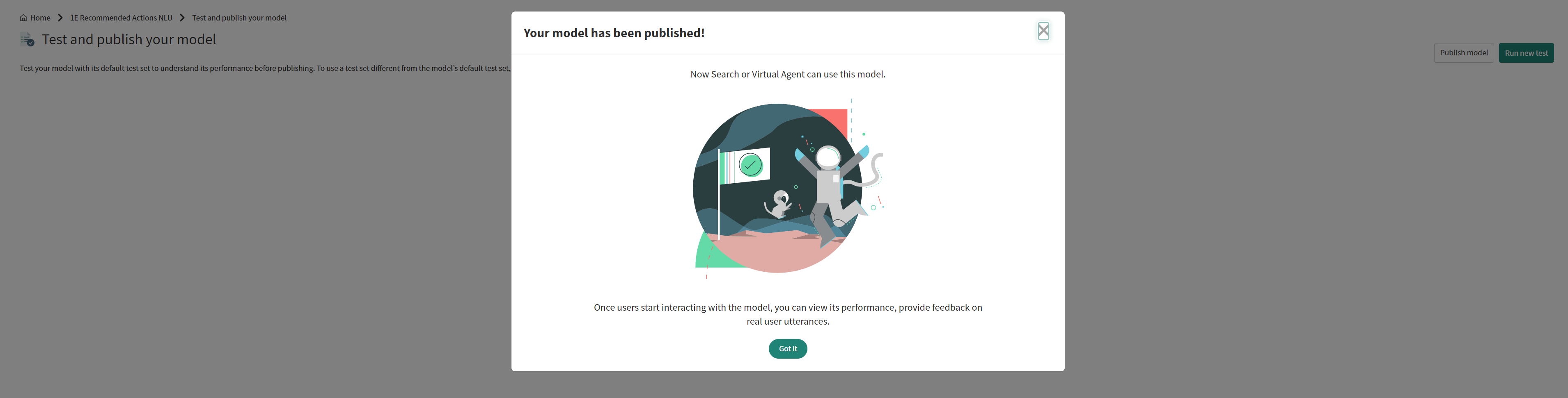Once the model is trained and published successfully, you must now map instructions with intents. For mapping instructions to intents, refer to Mapping intents with 1E instructions guide.