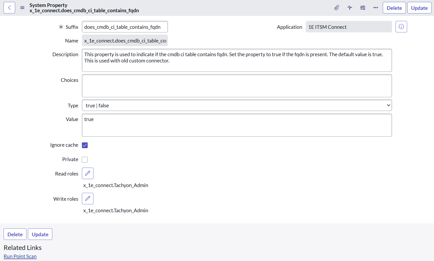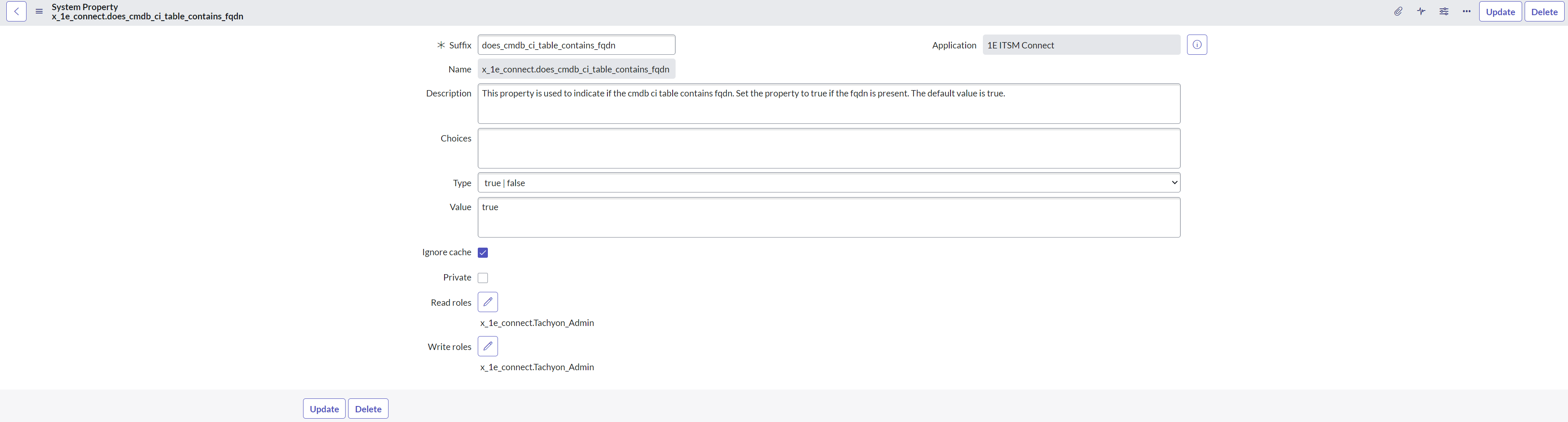 To enable this feature, the system property x_1e_connect.does_cmdb_ci_table_contains_fqdn has to be configured, and the value is set to false if custom connector is used. By default, this property is set to true.