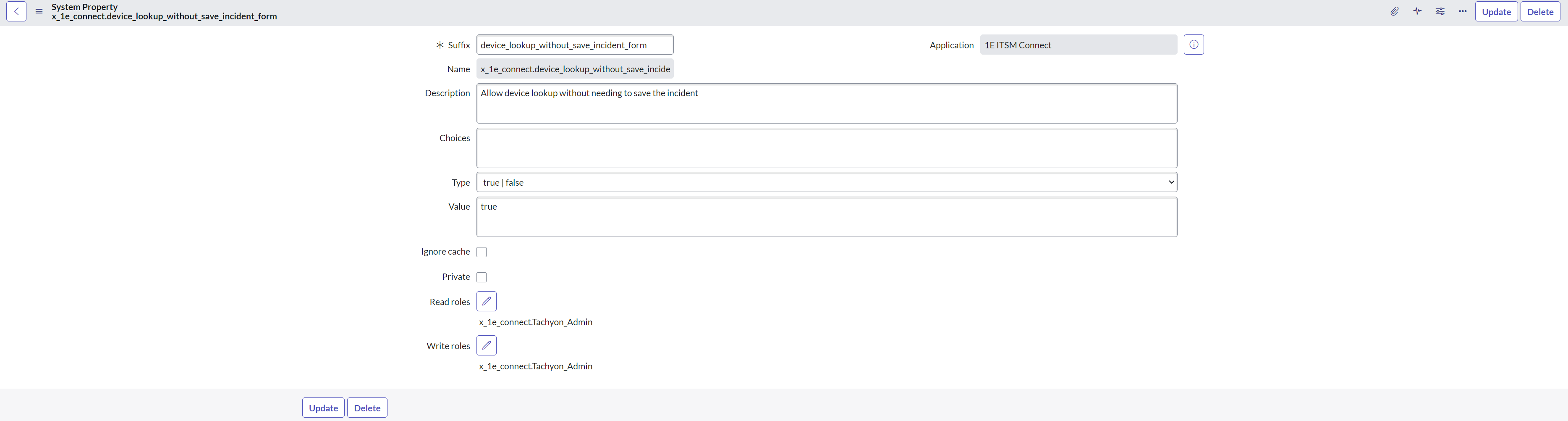To enable this feature, the system property x_1e_connect.device_lookup_without_save_incident_form has to be configured, and the value set to true. By default, this property is set to false.