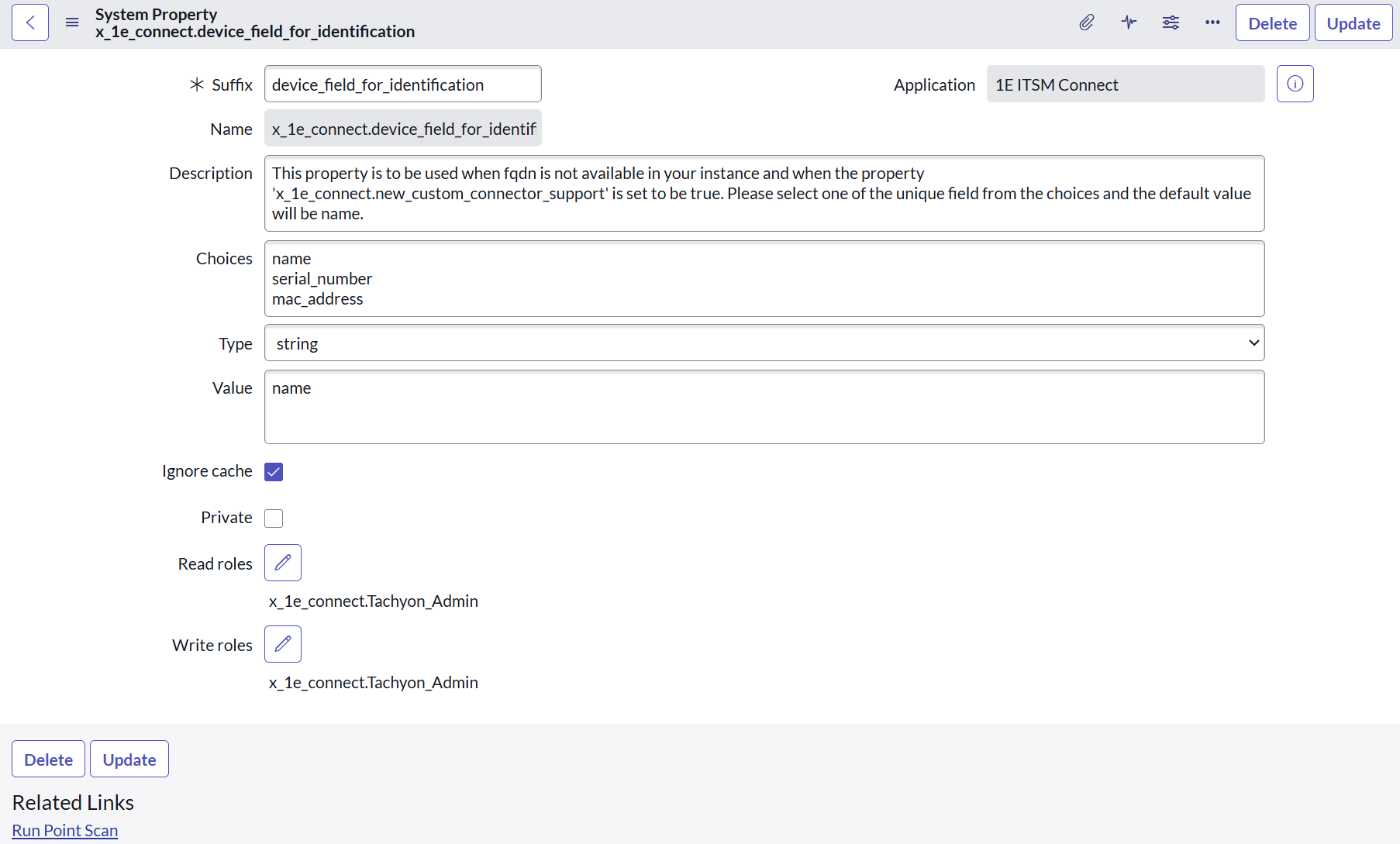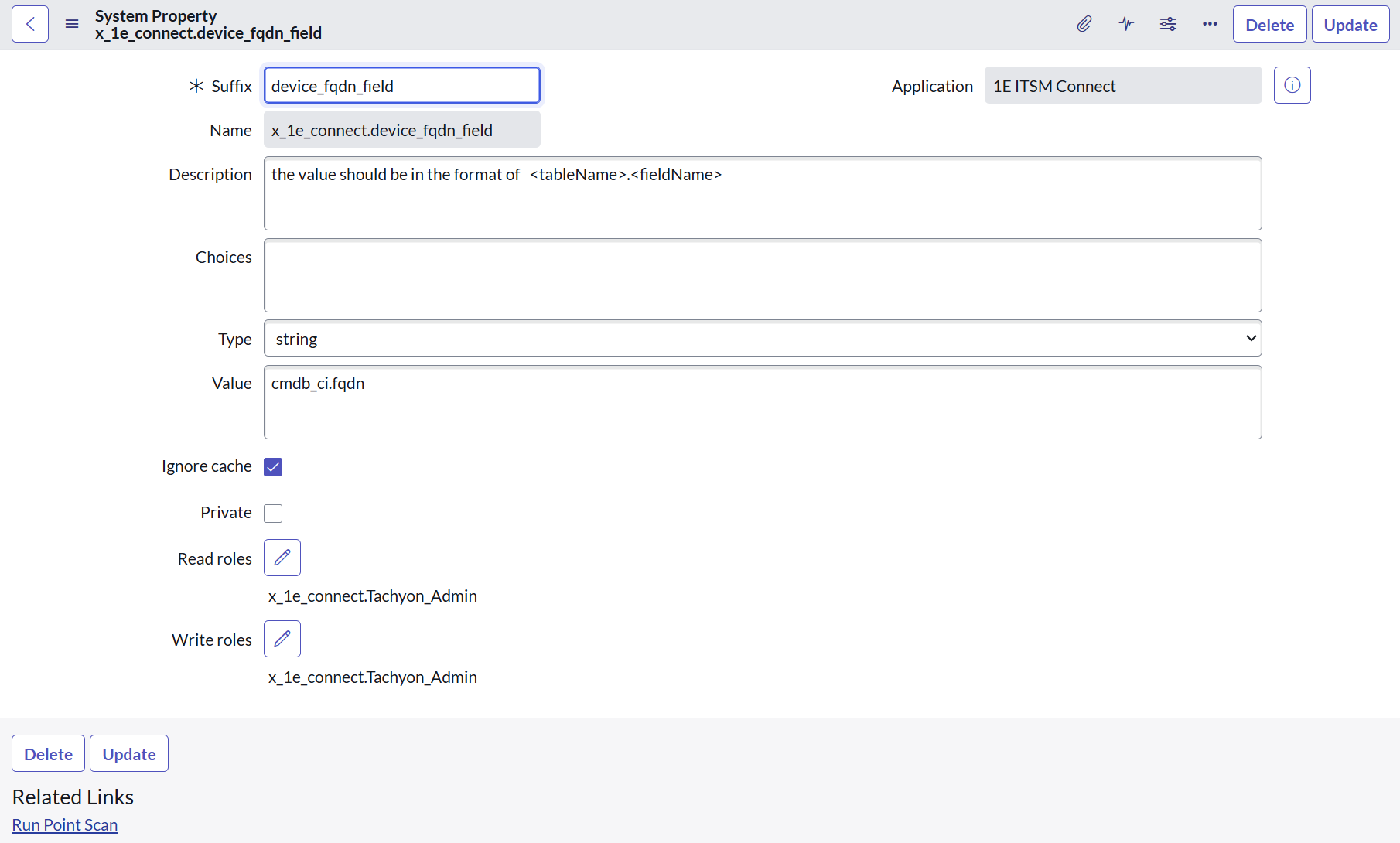 To support this feature of any table any field, the system property x_1e_connect.device_fqdn_field must be configured. This property allows the admin user to specify from which table and column values the value of device FQDN should be picked. The default value of this property is cmdb_ci.fqdn, where cmdb_ci is the table name and FQDN is the column name. The table and column names are separated by a .(dot).