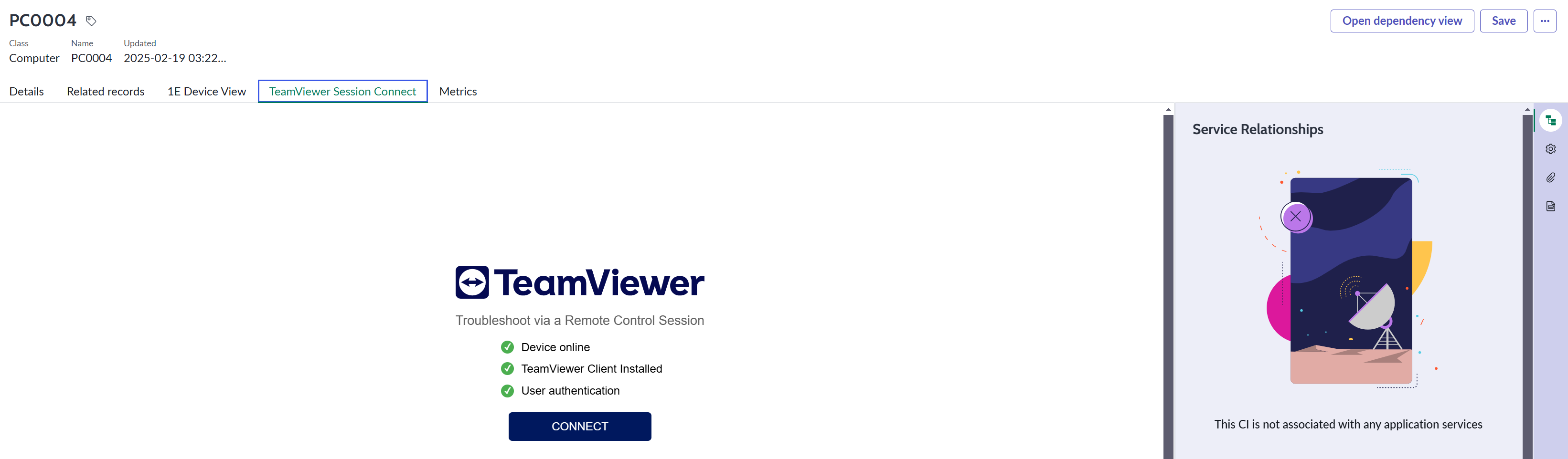 - To create a remote session using TeamViewer in ServiceNow, certain basic checks need to be completed before the Connect button becomes active. The Connect button will remain grayed out until the following checks are successfully done:
