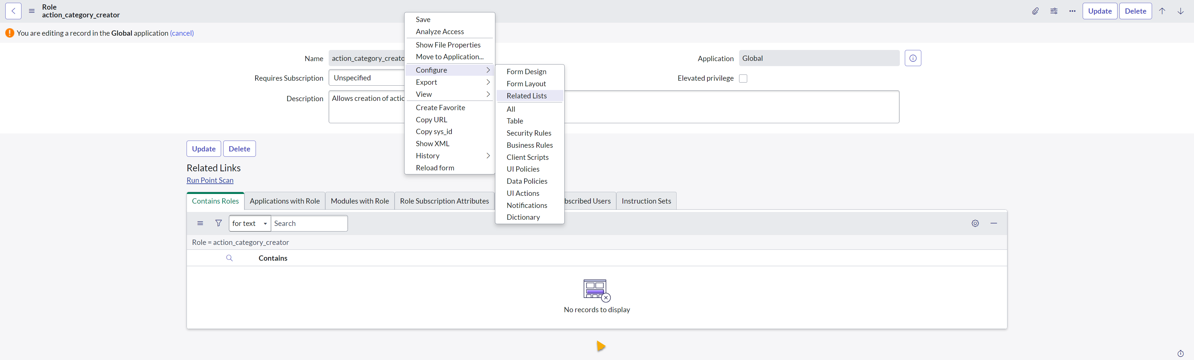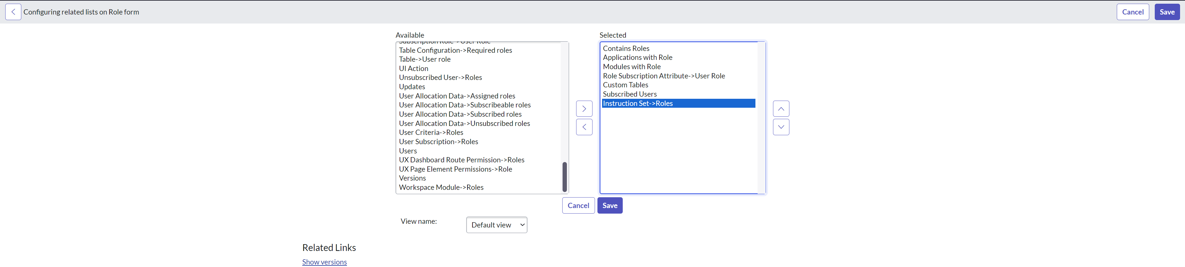 This opens the Configuring related lists on the role form. From here, add the Instruction set->Roles item from Available to the Selected list box. Click Save to save the changes.
