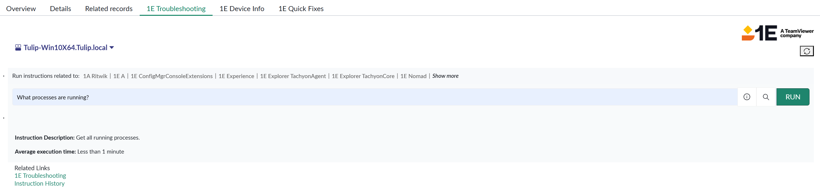 1E offers a wide range of instructions from 1E Exchange, designed to investigate devices and resolve issues throughout your entire enterprise. Using the 1E ITSM Connect application, you can access the same capabilities directly within ServiceNow. To enable this functionality, the instructions available in 1E must be synchronized and cached within ServiceNow, allowing you to run instructions and collect responses directly within a ServiceNow incident.