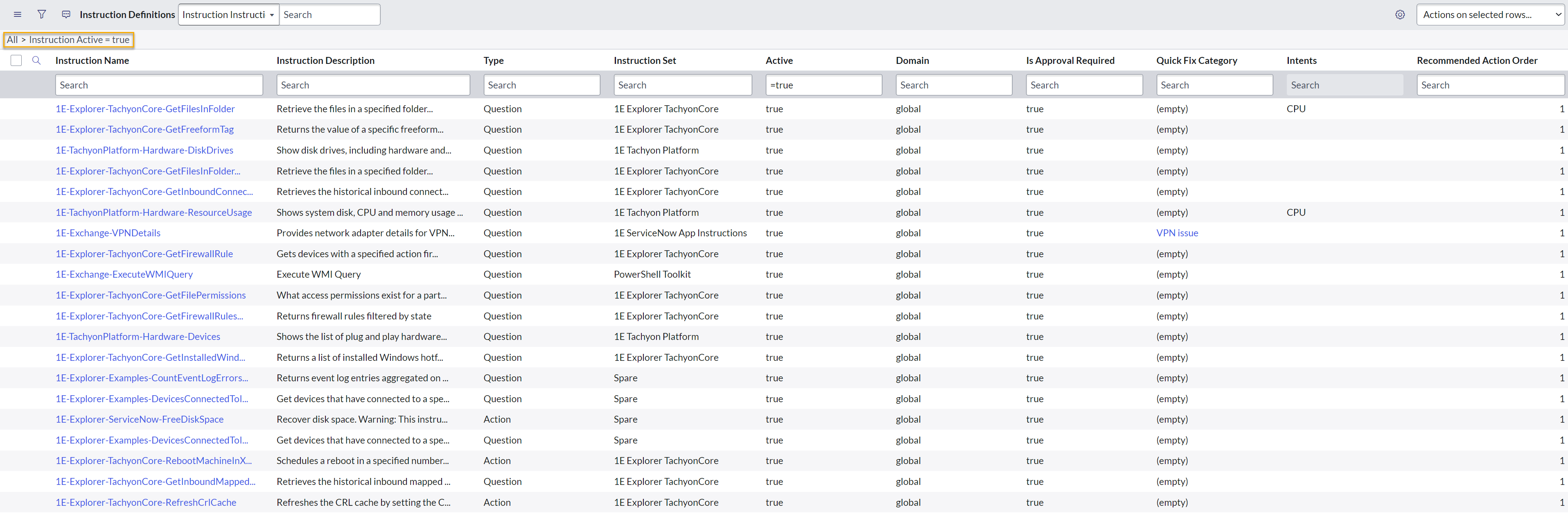 All the instructions available in ServiceNow can be seen on the Instruction Definitions page. The basic details about the instructions, such as name, description, Instruction Set etc. are displayed. The Type of the instruction is also visible on the page and tells you whether an instruction is an action or a question. You can choose which fields to display, based on your own needs.