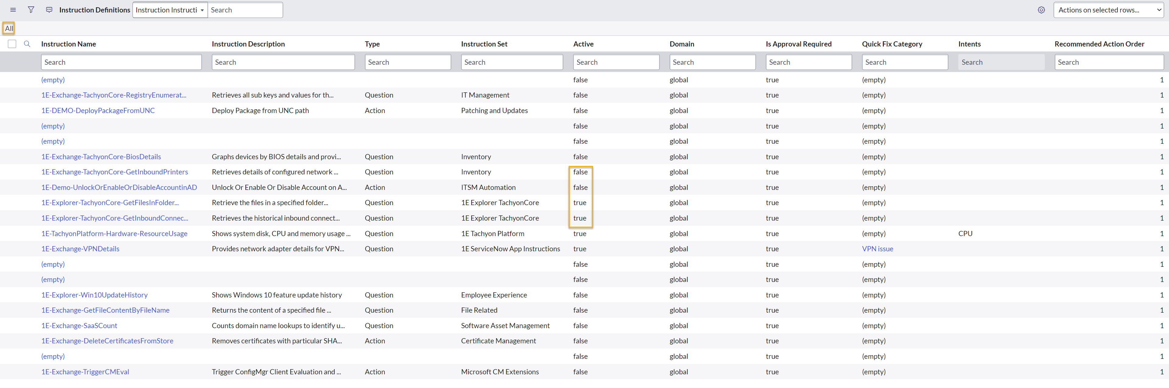 Instructions can be automatically disabled and marked as inactive by displaying false in the Active column, refer the below section for more details about automatically disabled instructions. The contents of the Instruction Definitions page are filtered so that only active instructions are displayed on the page by default.