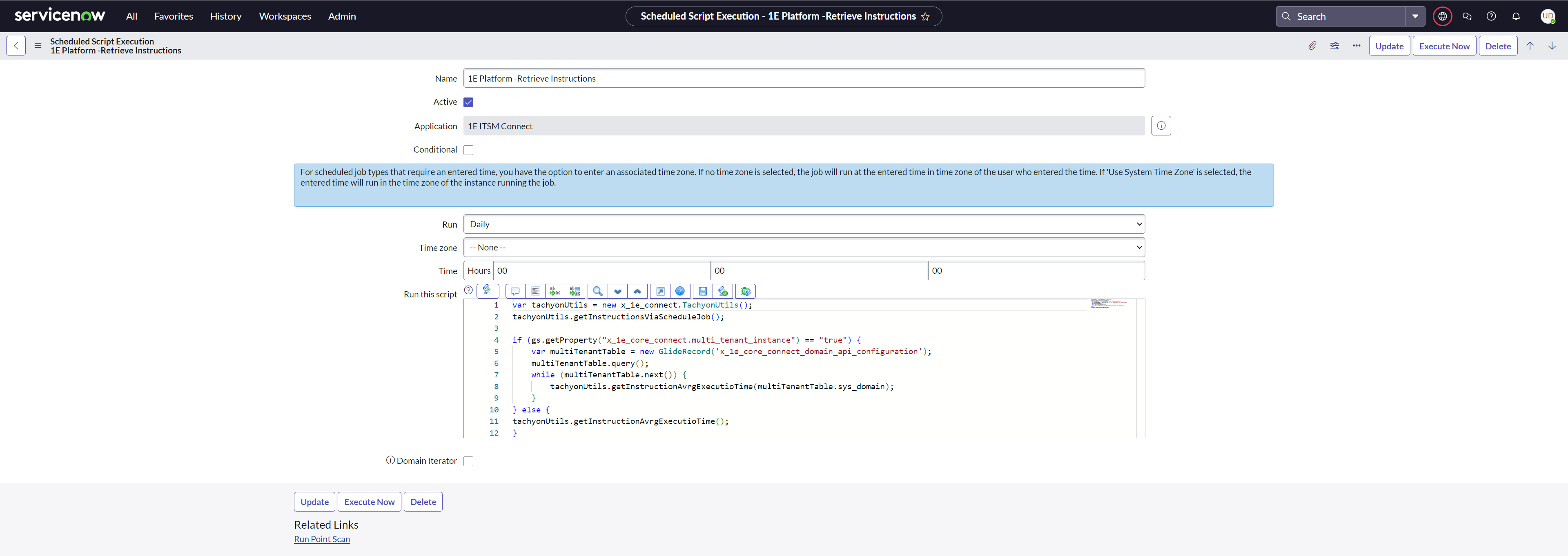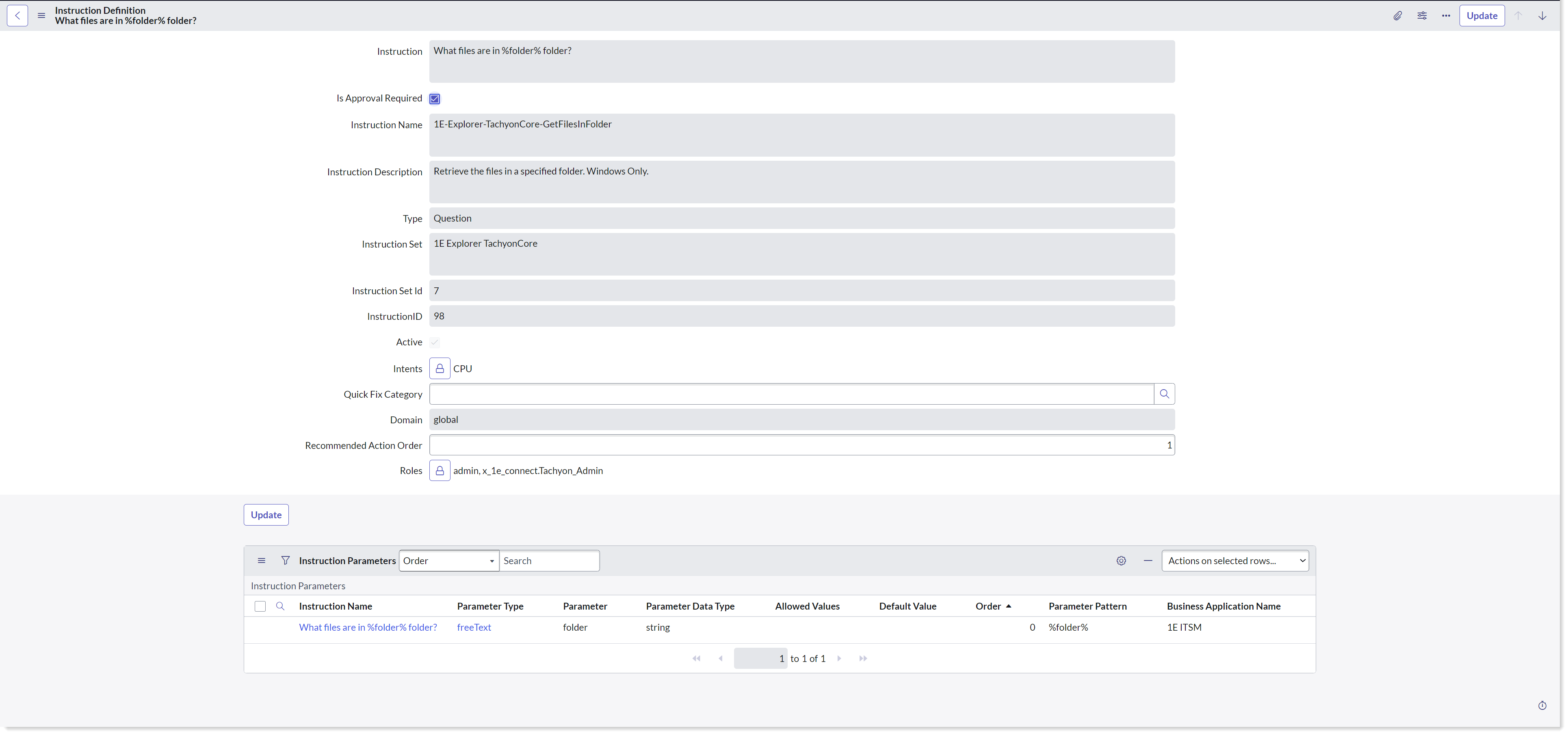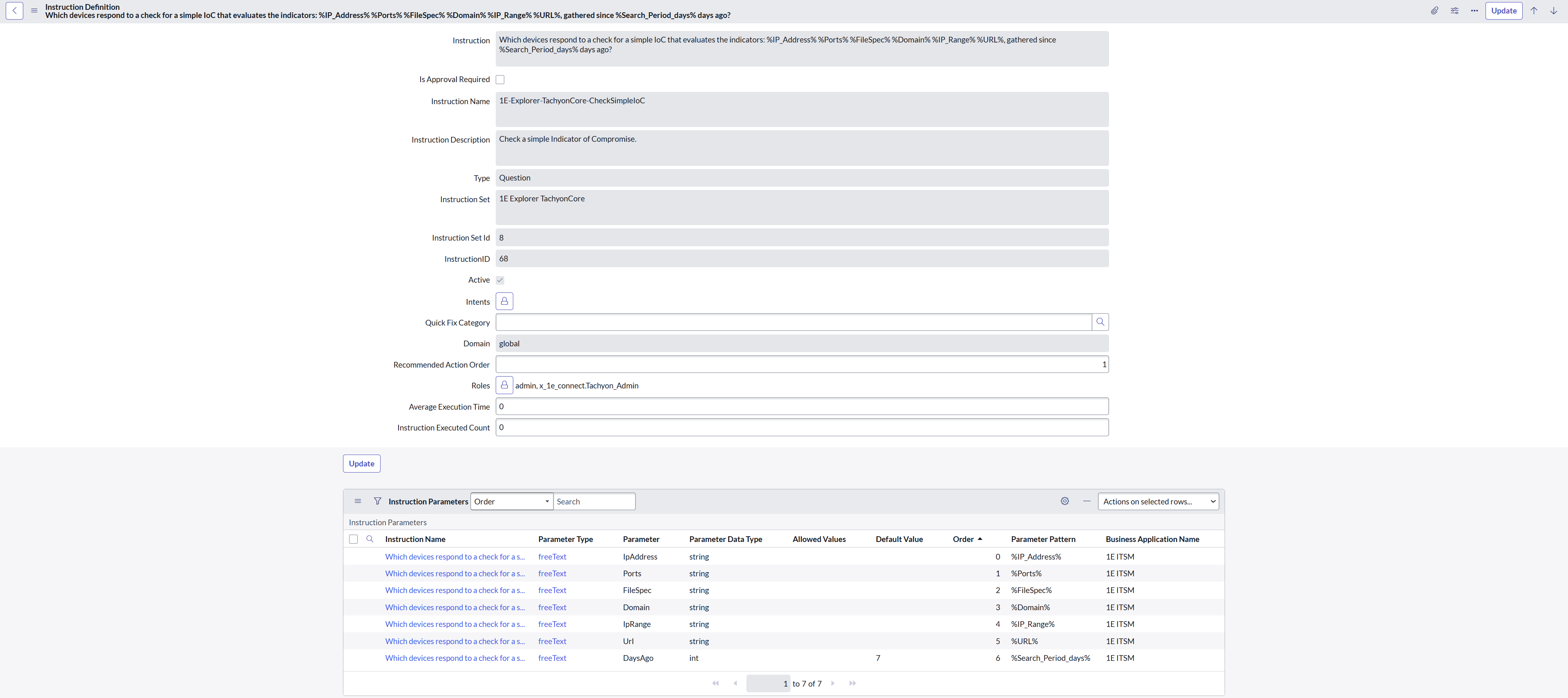 1E instructions are available in ServiceNow by clicking the Retrieve Instructions button on the App Configuration page. This fetches details of all the instructions currently available to the 1E ITSM Connect app 1E user, along with their parameters and stores them in the ServiceNow tables.