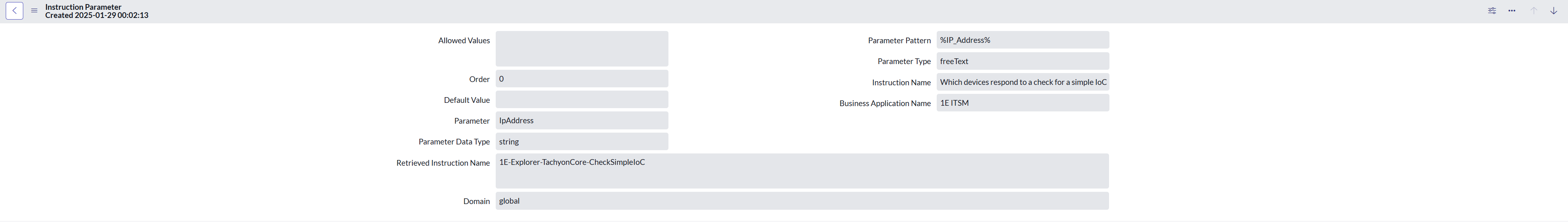 When you click the Parameter Type link on the Instruction Parameters table, the Instruction Parameter details page is displayed. All the details for the selected parameter are displayed on this page.