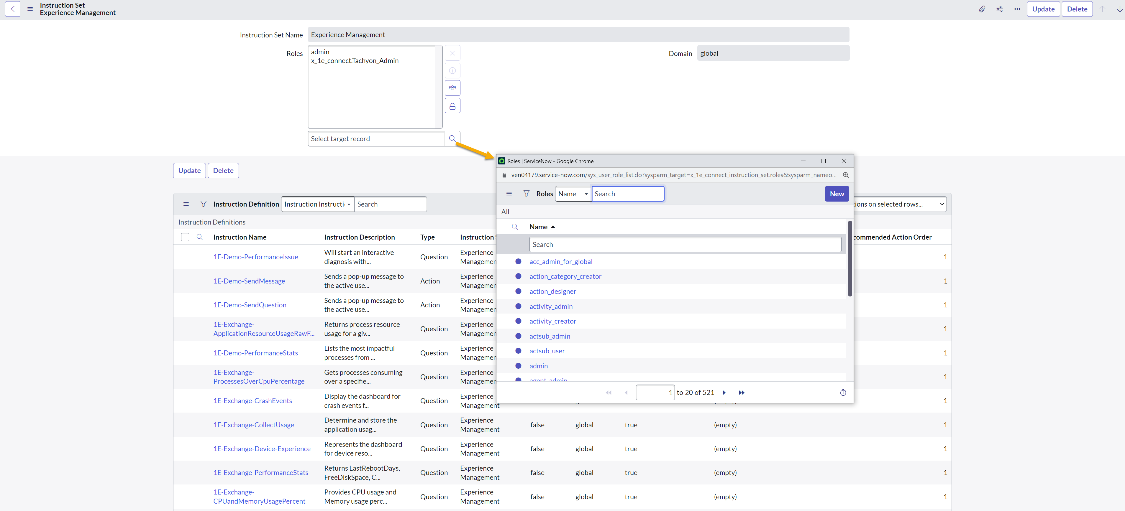 The 1E instructions that are available to any ServiceNow user with the x_1e_connect.Tachyon_User role, must be defined in 1E by setting the appropriate permissions on the proxy user role in 1E. For more details, refer to Configuring 1E Platform.