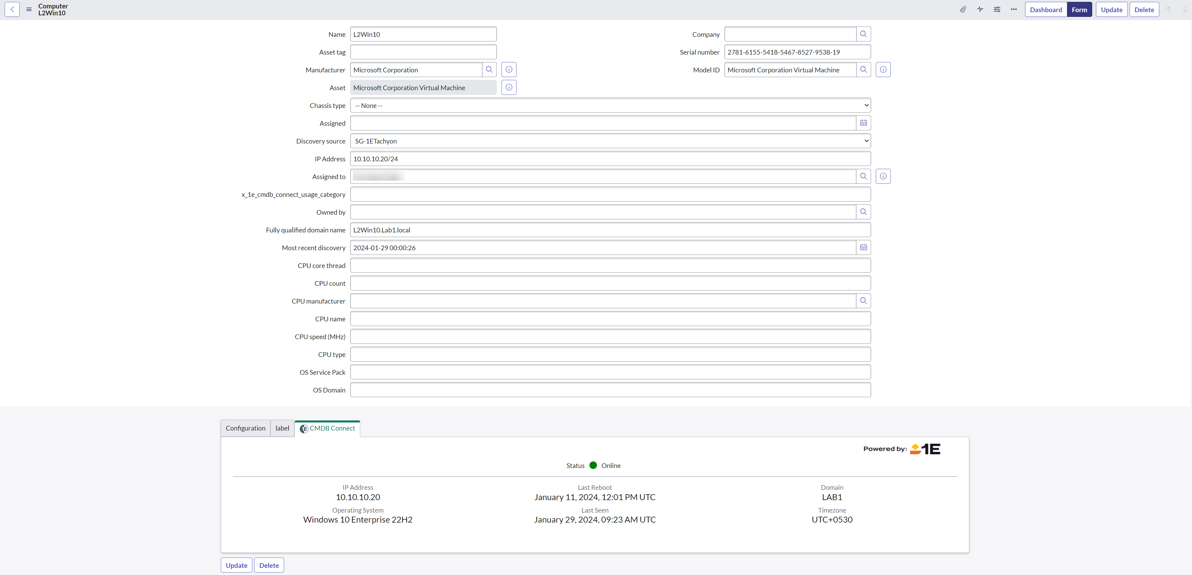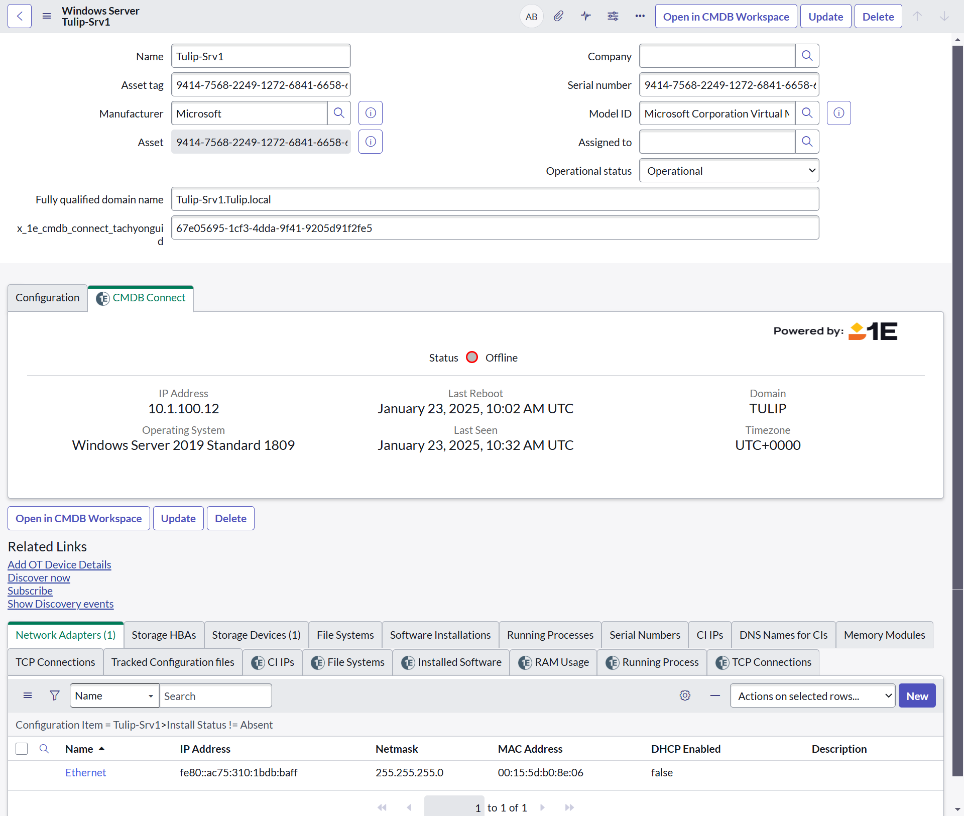 The 1E CMDB Connect tab displays real-time status information of a device with the help of 1E. When you click the 1E CMDB Connect tab, it opens the existing record for the device from the cmdb_ci_win_server table. It specifies the current status of the device, i.e. online or offline.