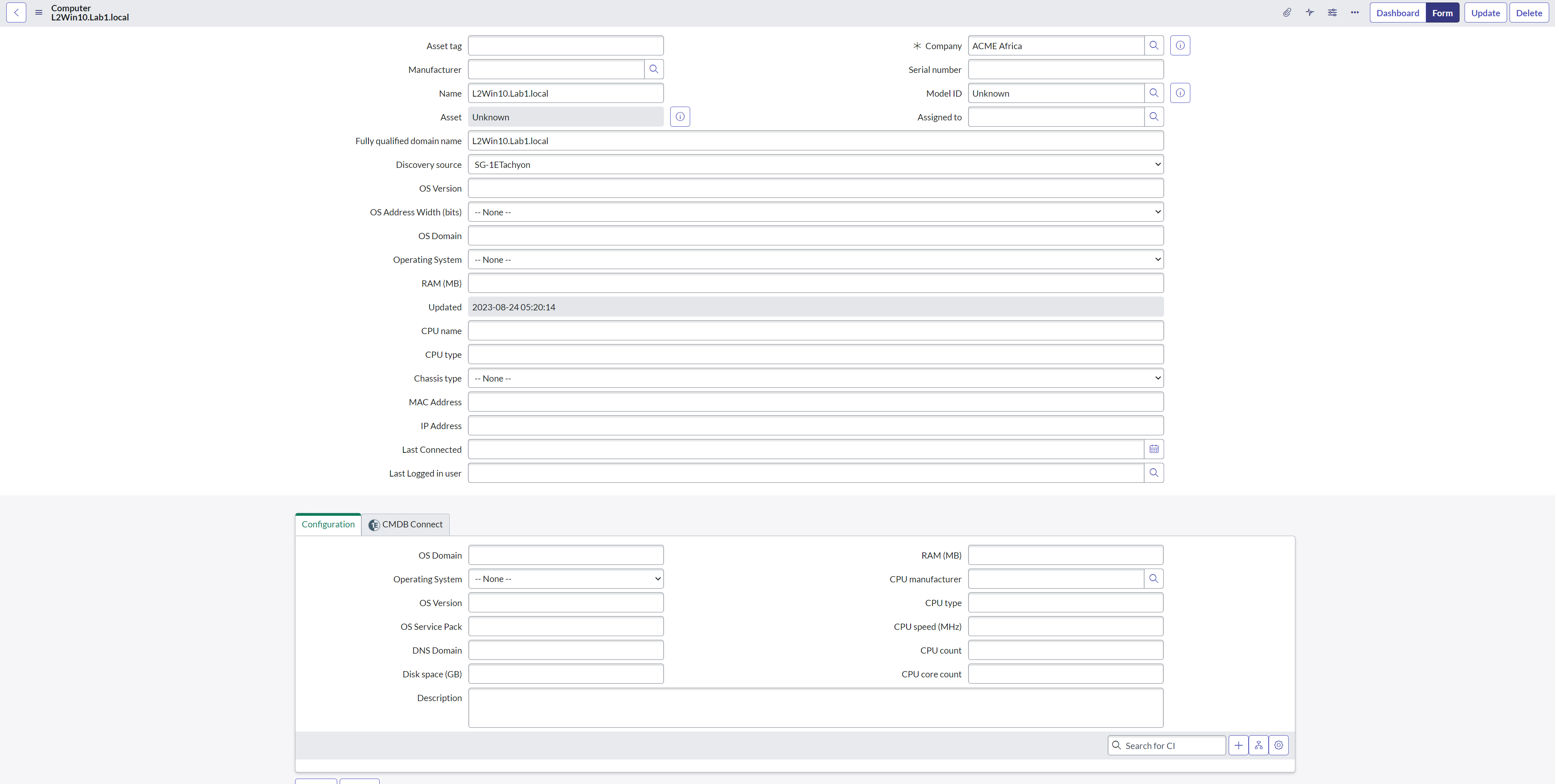The Configuration tab provides further details related to the device, such as the Operating System domain, type, version and service pack, all of which can be useful when attempting to manage the device remotely. The information displayed here is fetched from ServiceNow CMDB.