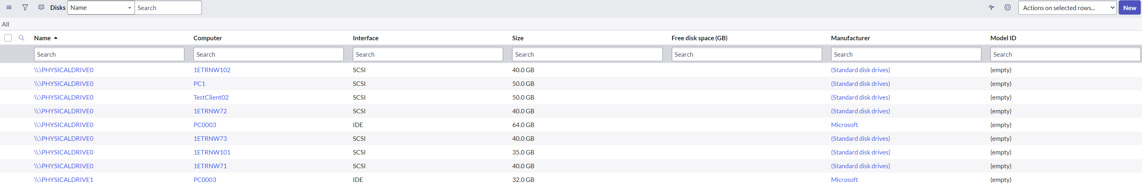 To navigate to the Disks page, type cmdb_ci_disk.list table name in the filter navigator and press enter. This opens up the Disks page in a new tab, as shown in the picture. This page has information about disk space on the end user devices.
