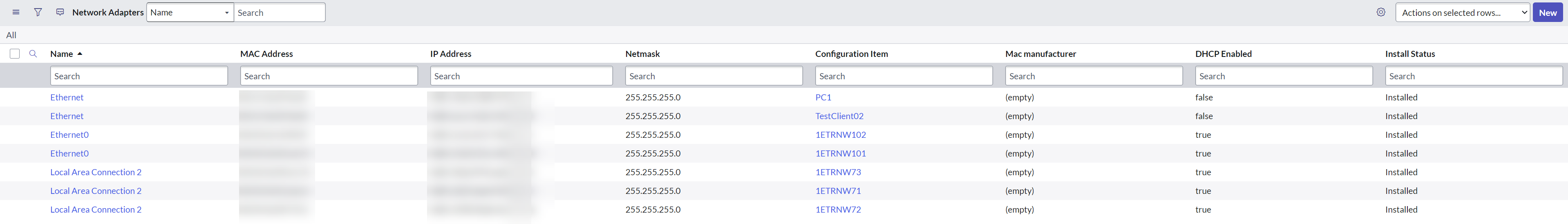 To navigate to the Network Adapters page, type cmdb_ci_network_adapter.list table name in the filter navigator and press enter. This opens up the Network Adapters page in a new tab, as shown in the picture. This page displays details about network adapters on end user devices.