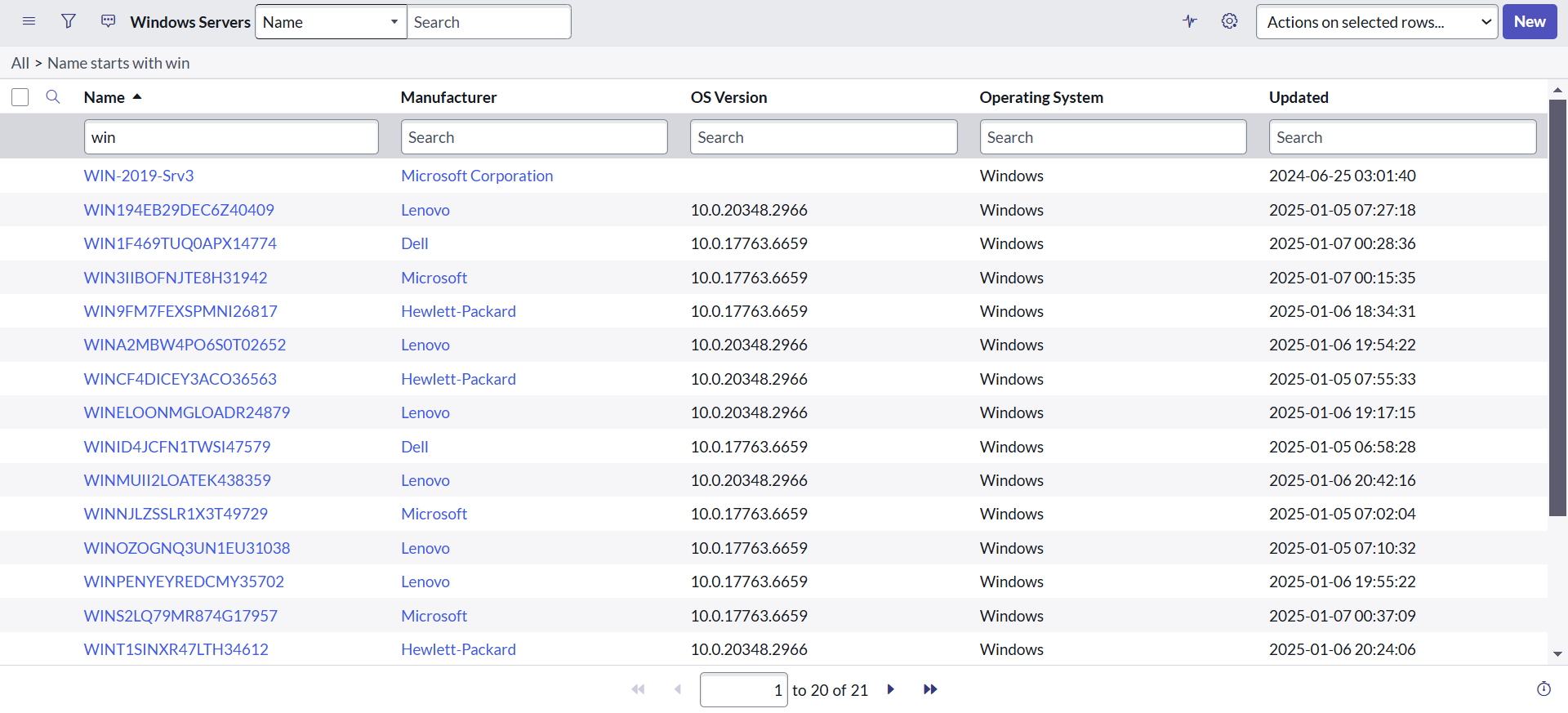 To navigate to the Windows Server page, type cmdb_ci_win_server.list table name in the filter navigator and press enter. This opens up the Windows Server page.