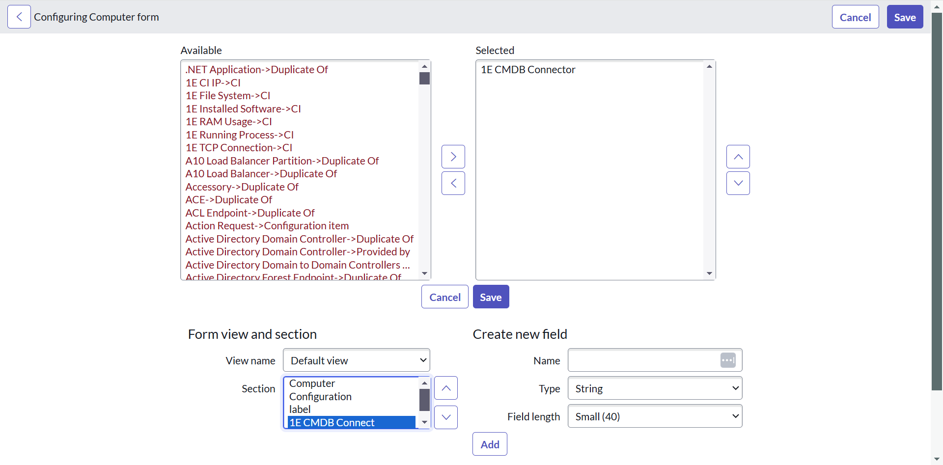 After you have successfully created the section, select 1E CMDB Connect in Section and move the 1E CMDB Connector item from Available to Selected list box. Click Save to complete the form layout setup.