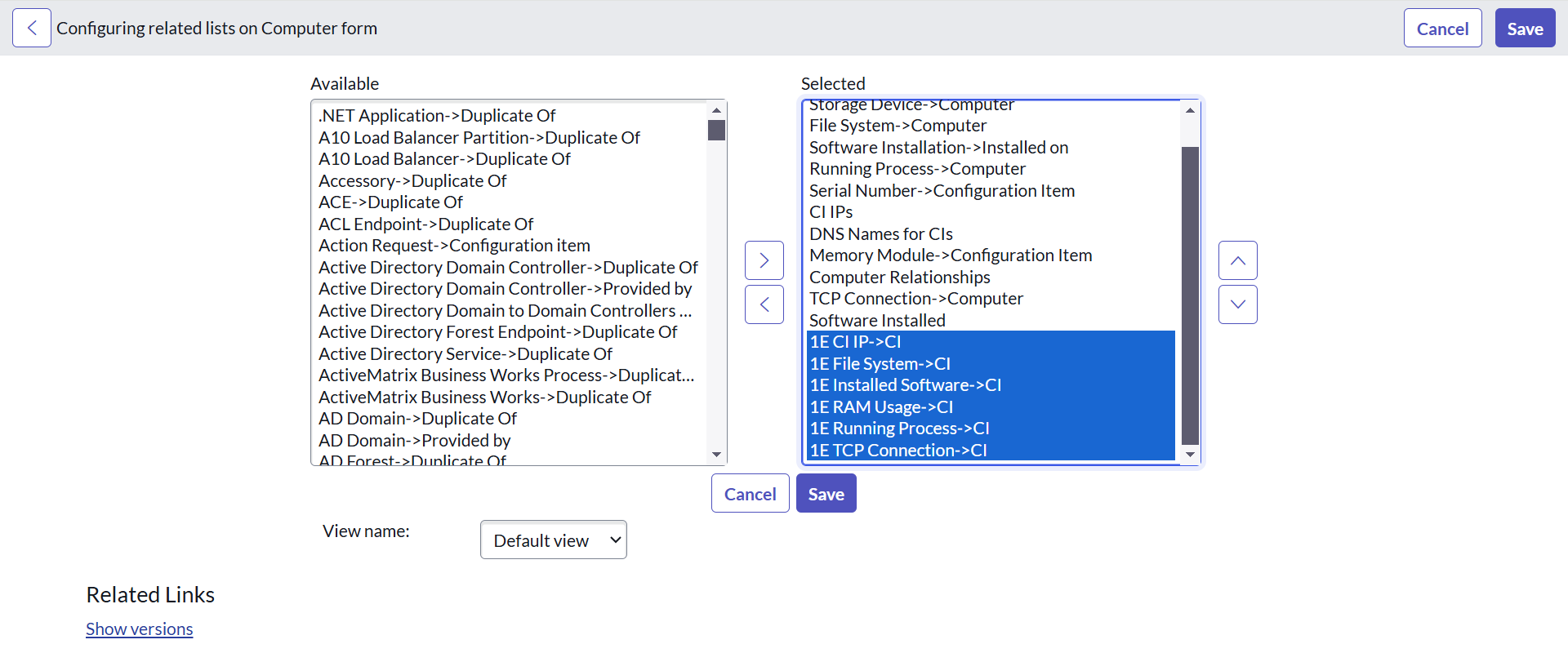 On the Configuring related lists on Computer form screen select all the six options with the 1E prefix present in Available list and move them onto right under Selected list using > arrow.