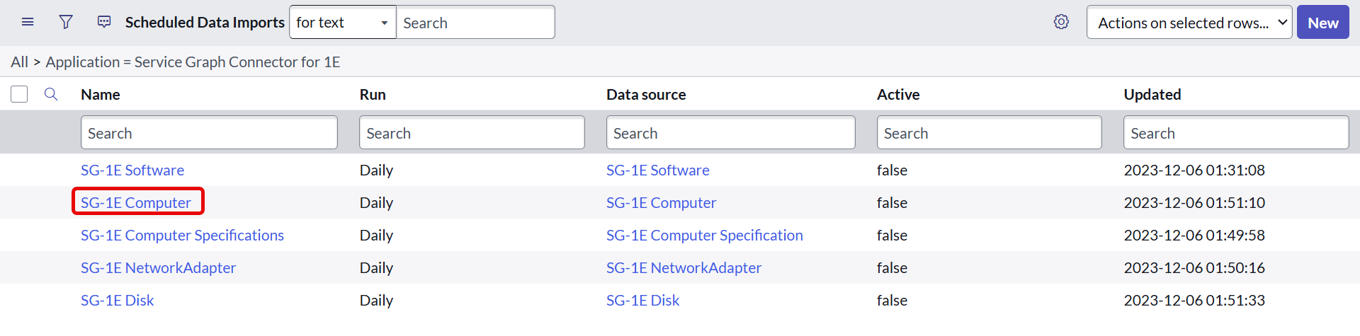 - Click Scheduled Imports tab given under SGC for 1E menu items on the left. The Scheduled Data Imports page displays the lists of all available Imports.