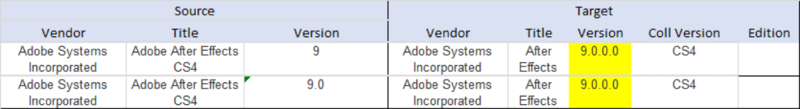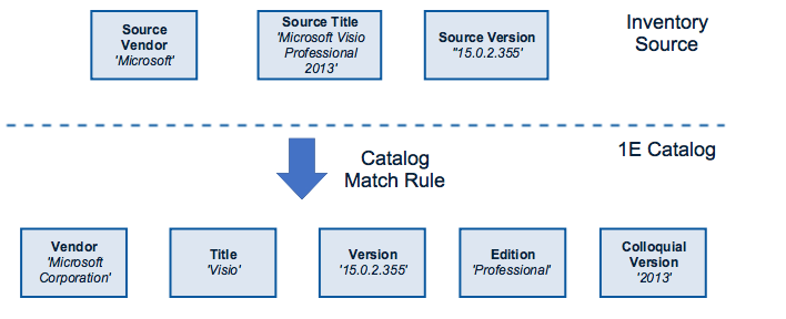 However, the corresponding entry in the Catalog has a different vendor and title resulting in a mismatch. To resolve this, the Catalog contains rules which directly match these types of entries. In this example, the product is edition-based (Visio) so the Catalog match rule is an edition match rule – linking the source to a specific edition of a specific version (15.0.2.355) of this title.
