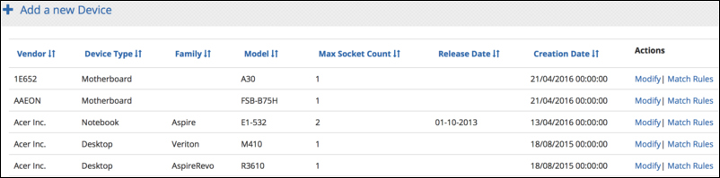 List of Catalog devices, click Managing match rules to update details of a device or Match Rules to edit an existing rule or associate a new rule with it.