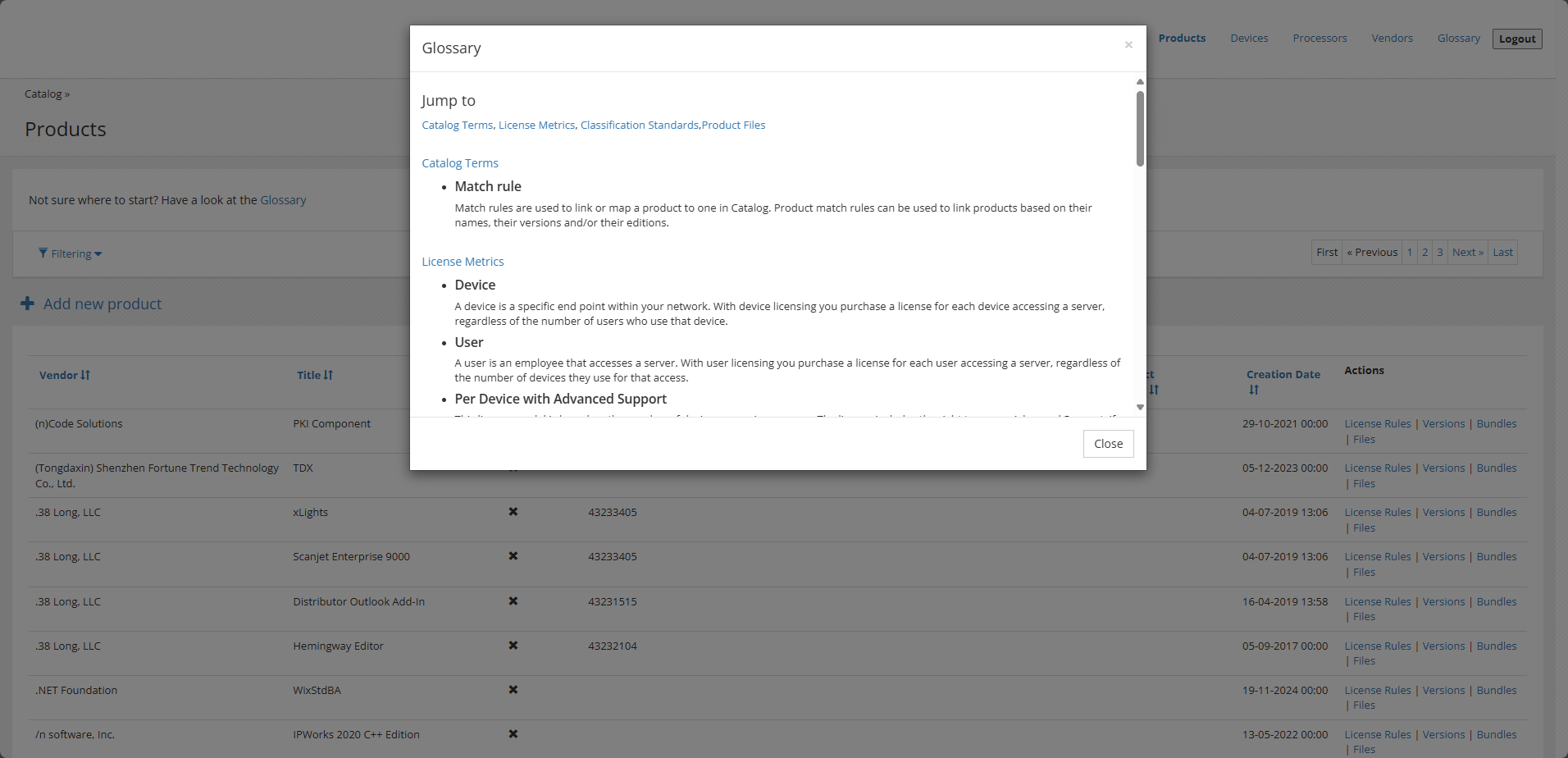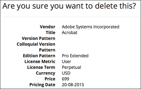 Licensing rules define how a product or a specific version of a product is licensed, for example, what metric they use or the average price of the license. You can set up different license rules for specific versions by using version patterns, for example, 10.*.* has license metric = Device; 11.* is licensed by User.