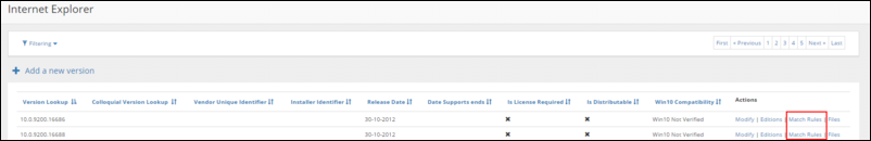 Under the Actions column, click the Match Rules link for that specific version.