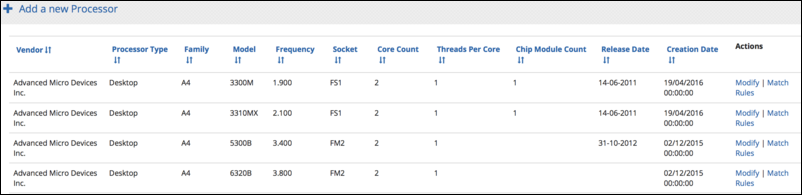 List of Catalog processors - click Modify to update the details of a processor or click Managing match rules to edit an existing rule or associate a new rule with it.