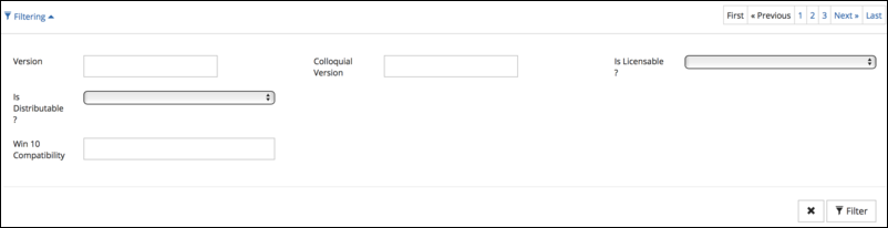 To view a software product's versions, click the Version link to the right of the product screen to show a list of versions for that product, refer to Using filters.