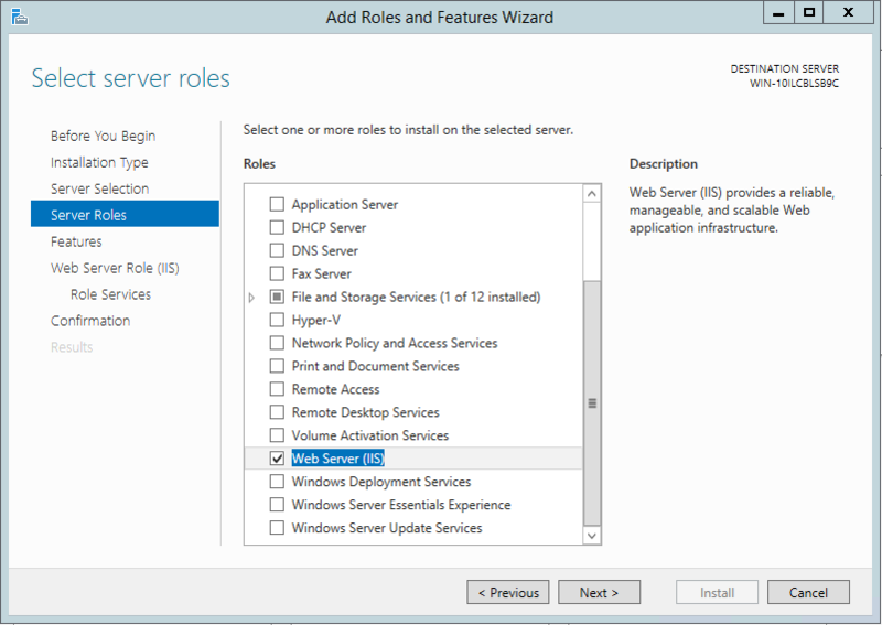 On the Server Roles page, check the Web Server (IIS) server role.