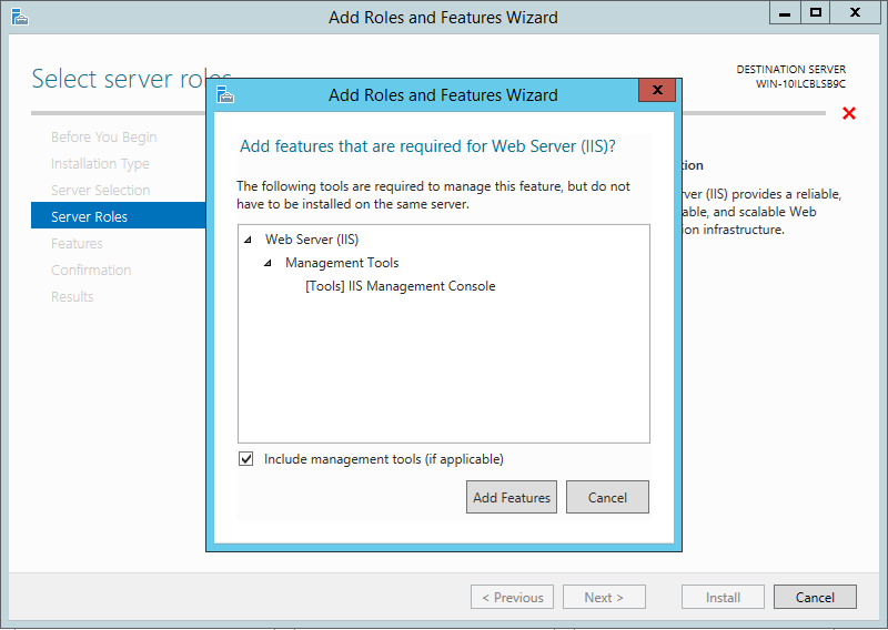 In the dialog, click Add Features to add the features required for Web Server (IIS).