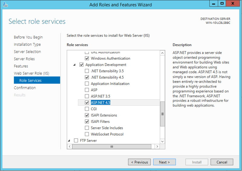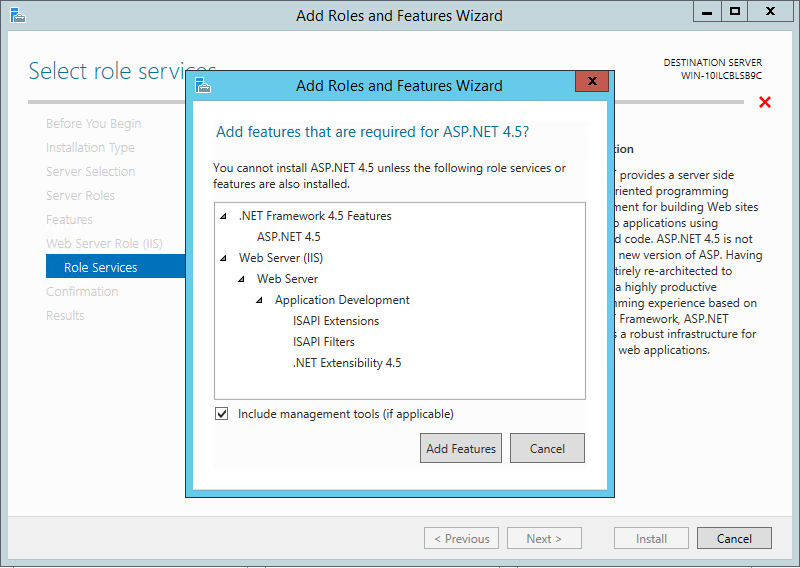 When you select ASP.NET 4.5 you will be prompted to add features related to that role. Click Add Features in the dialog to add all the features.