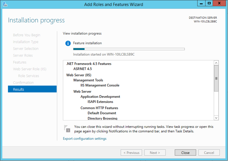 After you have made the necessary changes, click Install to begin the role installation. Installation progress is displayed while the components are being installed.